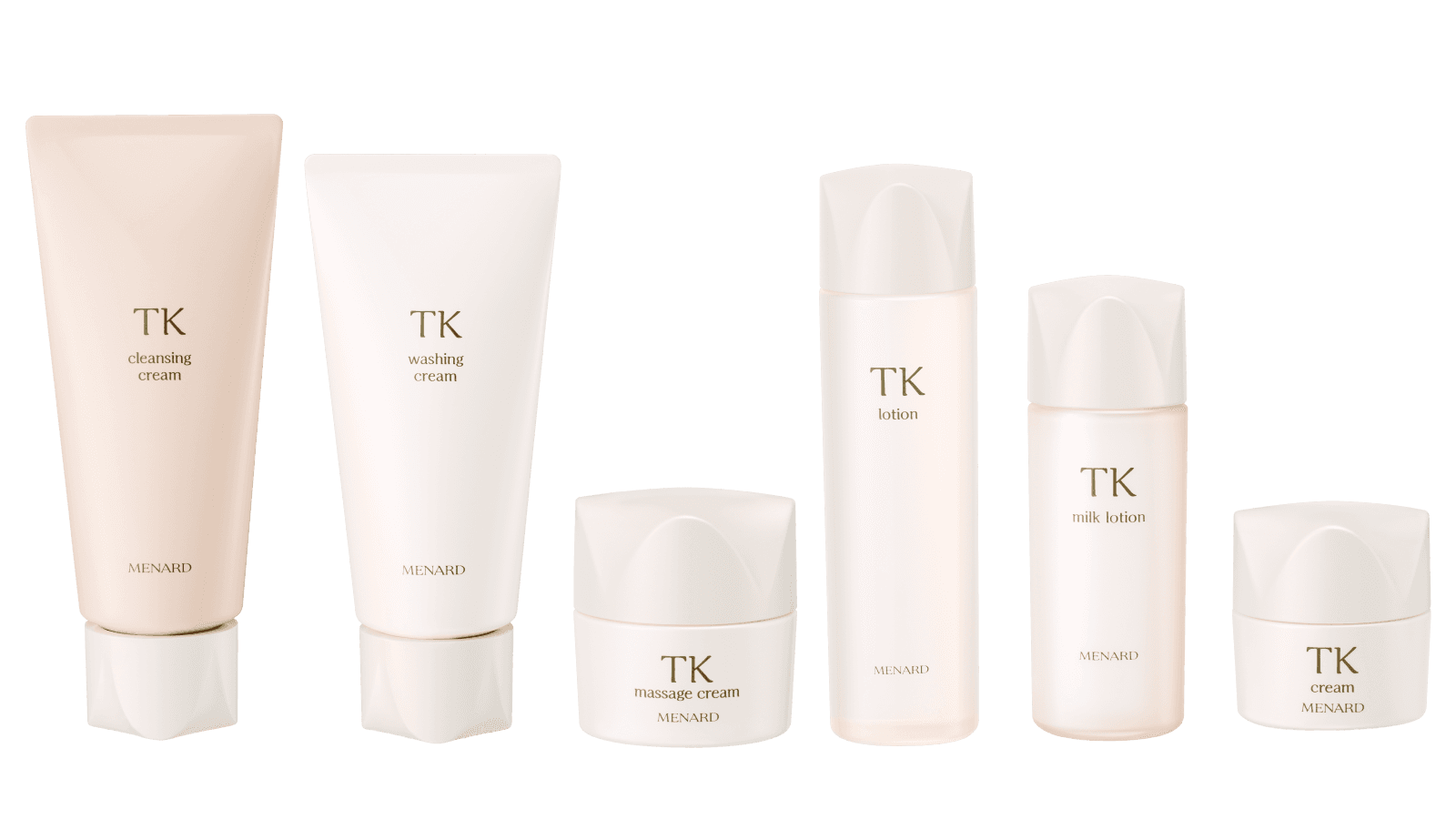 左から、ファンデーションなどをほどくようにするんと落とす、⼼地よいクレンジング。洗い流し、ふきとり両用。TK クレンジングクリーム 130g ¥2,750/スムーズに泡⽴ち、ふんわりとクリーミィでやわらかな泡が肌を包み込み、汚れを落とす。TK ウオッシングクリーム 130g ¥2,750/なめらかなタッチで最後まで⼼地よいマッサージができる。洗い流し、ふきとり両用。TK マッサージクリーム 80g ¥3,300/肌当たりの⼼地よいとろみのあるローションが肌にぐっとなじむ。TK ローション 150mL ¥3,300/肌に溶け込むようになじみ、ベタつかず⼼地よさで包む。TK ミルクローション 100mL ¥3,300/なめらかにのび、就寝中の肌をしなやかなヴェールで包み込み、うるおいを守る。肌に密着し、肌のすみずみまでうるおいをじっくり届けるスリーピングパックとしても使える。TK クリーム 30g ¥4,400