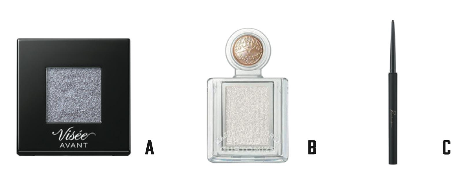 「黒のアイライナーとBのシルバーのアイシャドウで目の周りを囲い、'80~'90年代を感じるAの青みラメをアイホールや目頭に入れて、トレンドのスモーキーアイに仕上げました。ベージュのリップで抜け感を出して大人っぽく」(辻村さん)