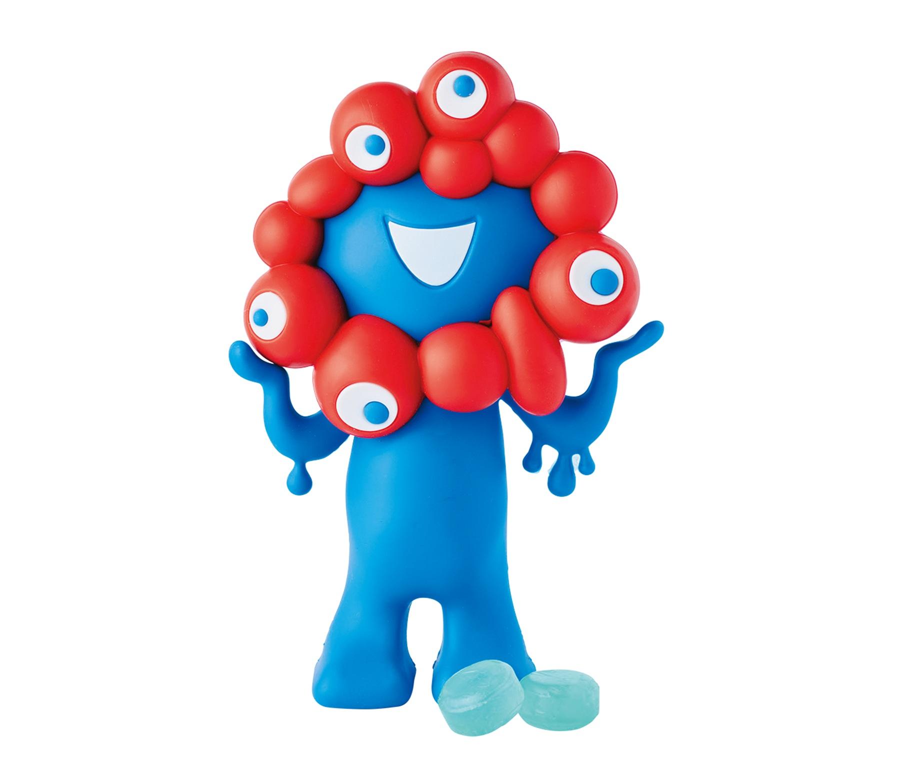 ミャクミャクの背中のジッパーを開けると、中にはサイダー味のキャンディが。ポーチは小物入れとしてはもちろん、自立するのでオブジェとしても楽しめる。「EXPO2025 ポーチキャンディ」6個入り¥2,200(D)