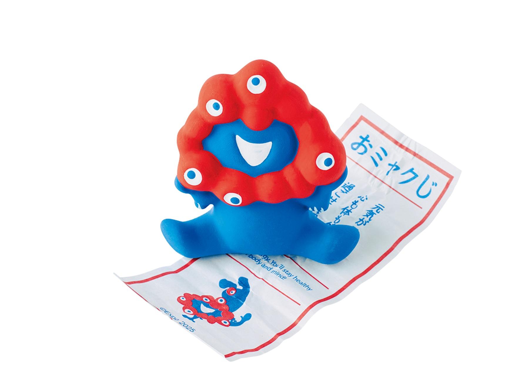 1000年以上の歴史と伝統を誇る瀬戸焼で作られたミャクミャク。底面の紐を引くと、ミャクミャクからのお告げが書かれたおミャクじが。心が前向きになるような言葉が綴られている。「瀬戸焼のおミャクじ」¥1,650(C)