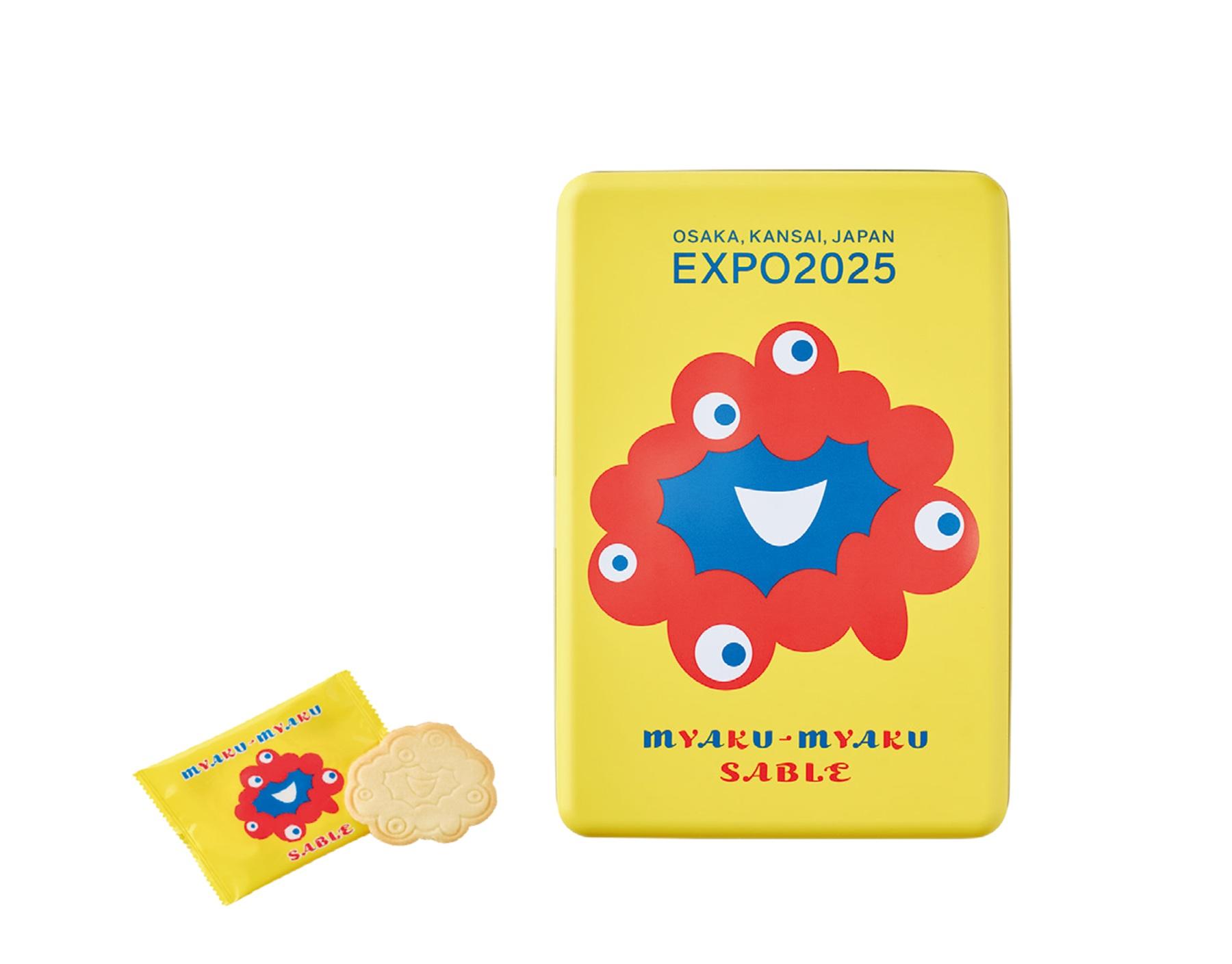 ミャクミャクの顔のパッケージがインパクト大。飾っておきたいほどかわいい缶の中には、ミャクミャク形のサブレが入る。大阪・関西万博のバラマキみやげにもピッタリ。「EXPO2025 サブレ」10枚入り¥1,550(A・B)