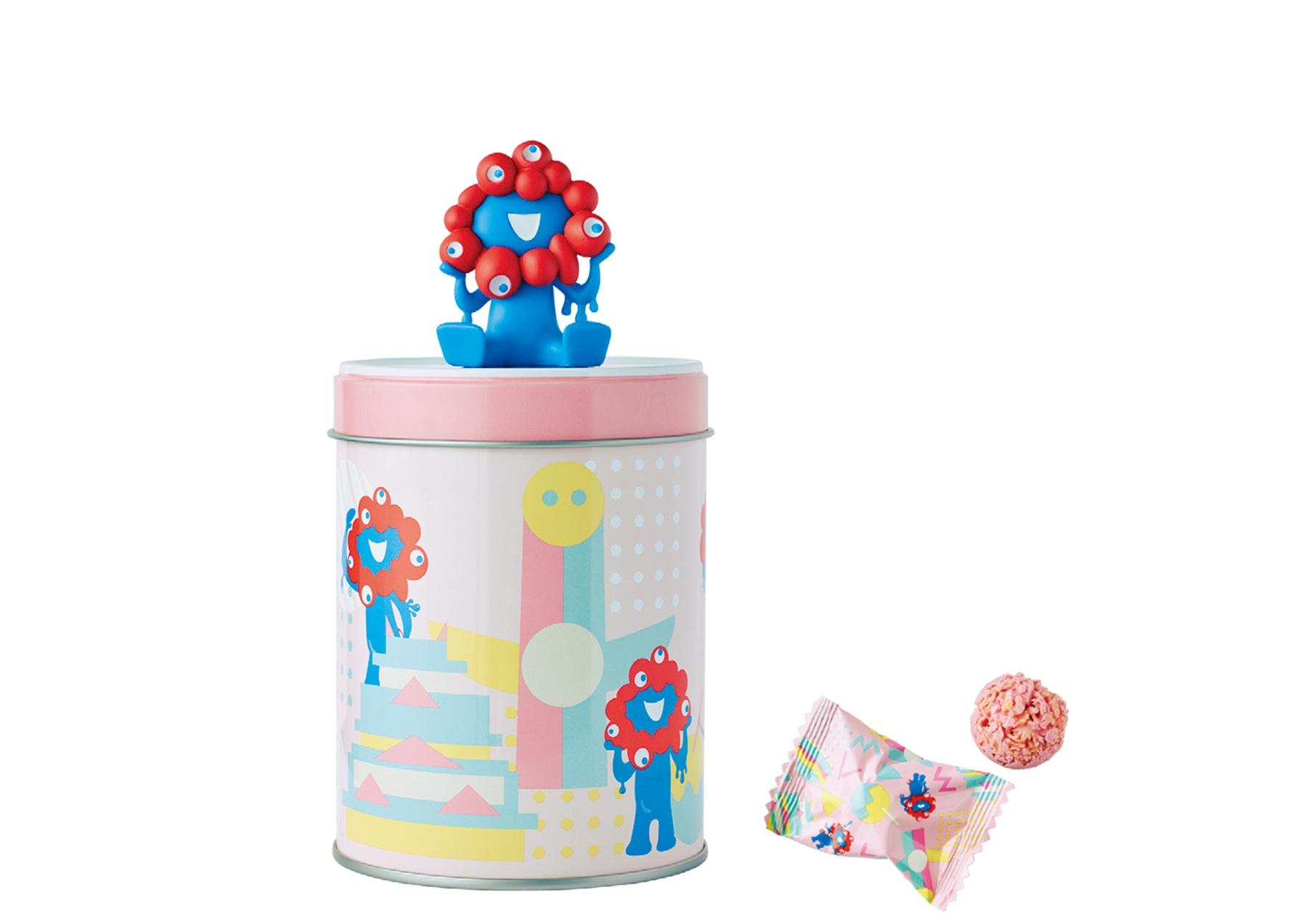 大阪の観光スポットを巡るミャクミャクがデザインされた缶の中には、甘酸っぱいいちご味のクランチチョコが。缶の上にはミャクミャクのフィギュアマグネットも。「大阪・関西万博いちごクランチ缶」7個入り¥1,870(A)