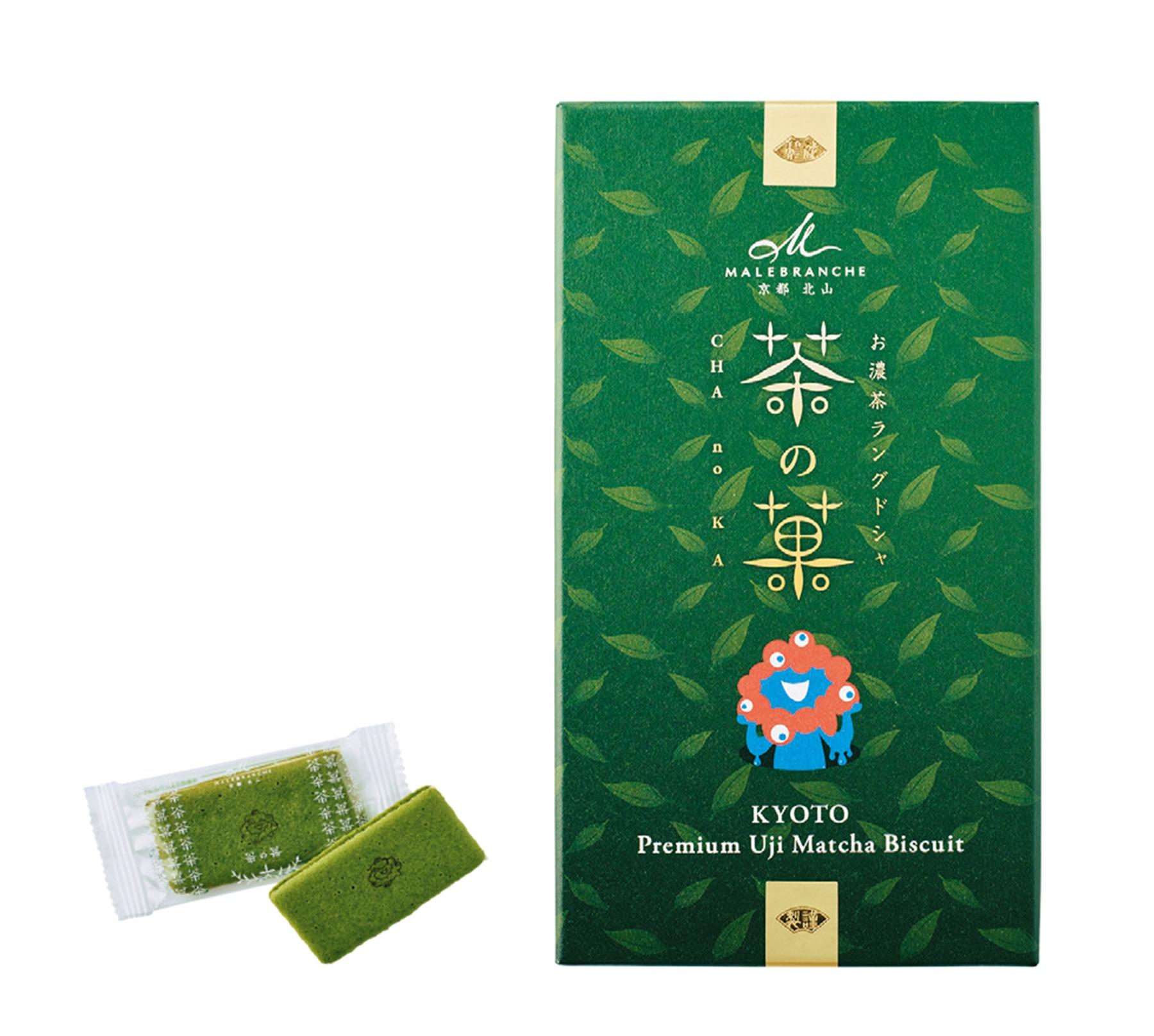 『マールブランシュ』とコラボして生まれた、宇治茶を使用した口どけの良い生地で、ホワイトチョコレートをサンドしたラングドシャ。表面にはミャクミャクの焼き印が。「お濃茶ラングドシャ『茶の菓』」8枚入り¥1,641(B)