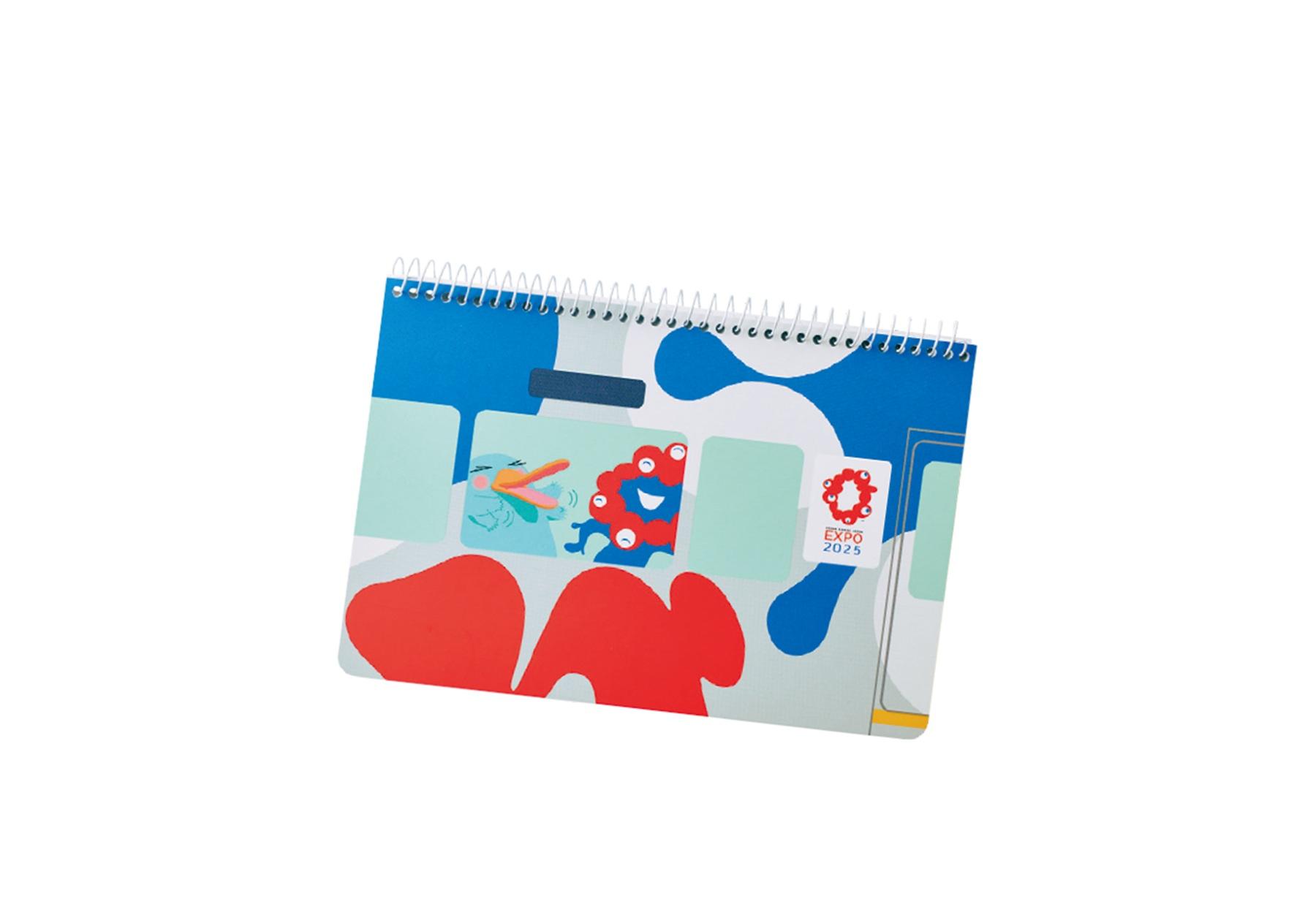 ミャクミャクとJR西日本「ICOCA」キャラクター「カモノハシのイコちゃん」が、仲良く電車に乗っているデザインが印象的。「EXPO2025 ミャクミャク【大阪・関西万博ラッピング新幹線】B6リングノート」¥880(D)