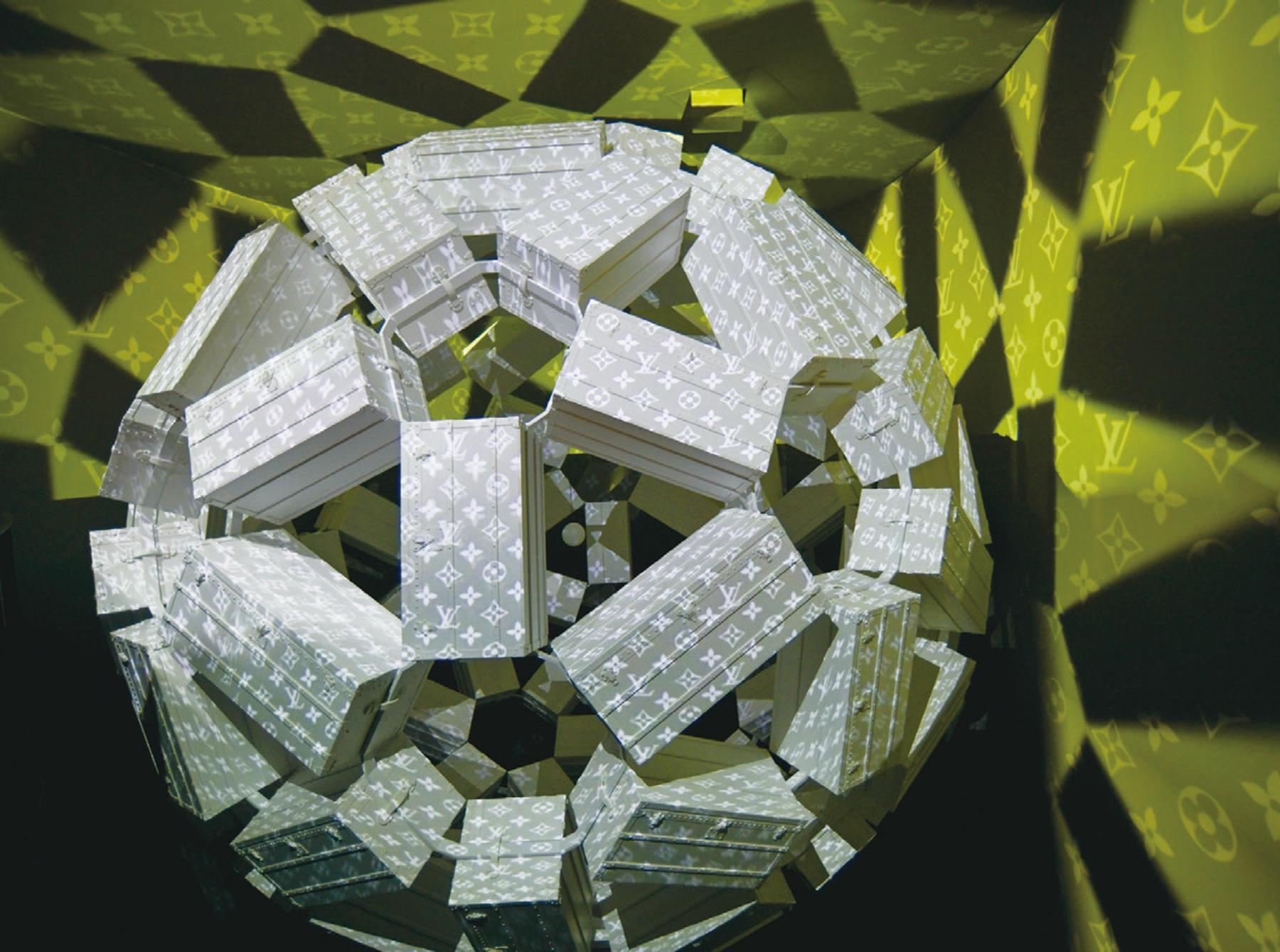 ルイ・ヴィトンのトランクで作った球体「トランクのスフィア」。アーティストの真鍋大度さんが手がけた映像作品が投影され、幻想的な五感の旅へと誘う。