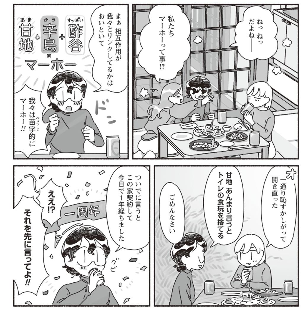 酢谷は一人暮らしのフリーランスWebエンジニア。辛島は恋人と同棲中、甘地は実家暮らしで、共に会社員。三者三様のキャラクターが魅力的。マガジンハウス 1210円 Ⓒはしゃ/マガジンハウス