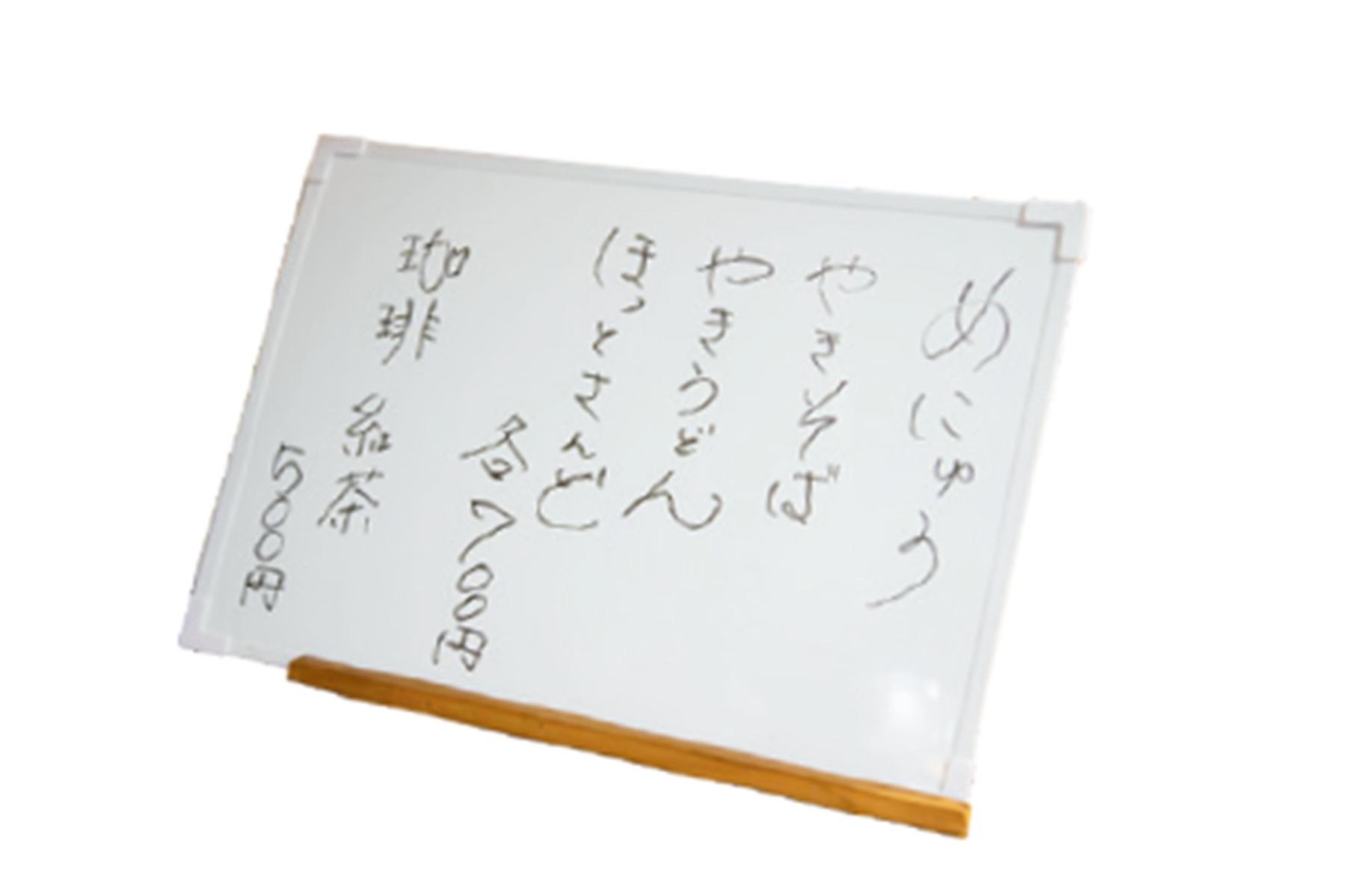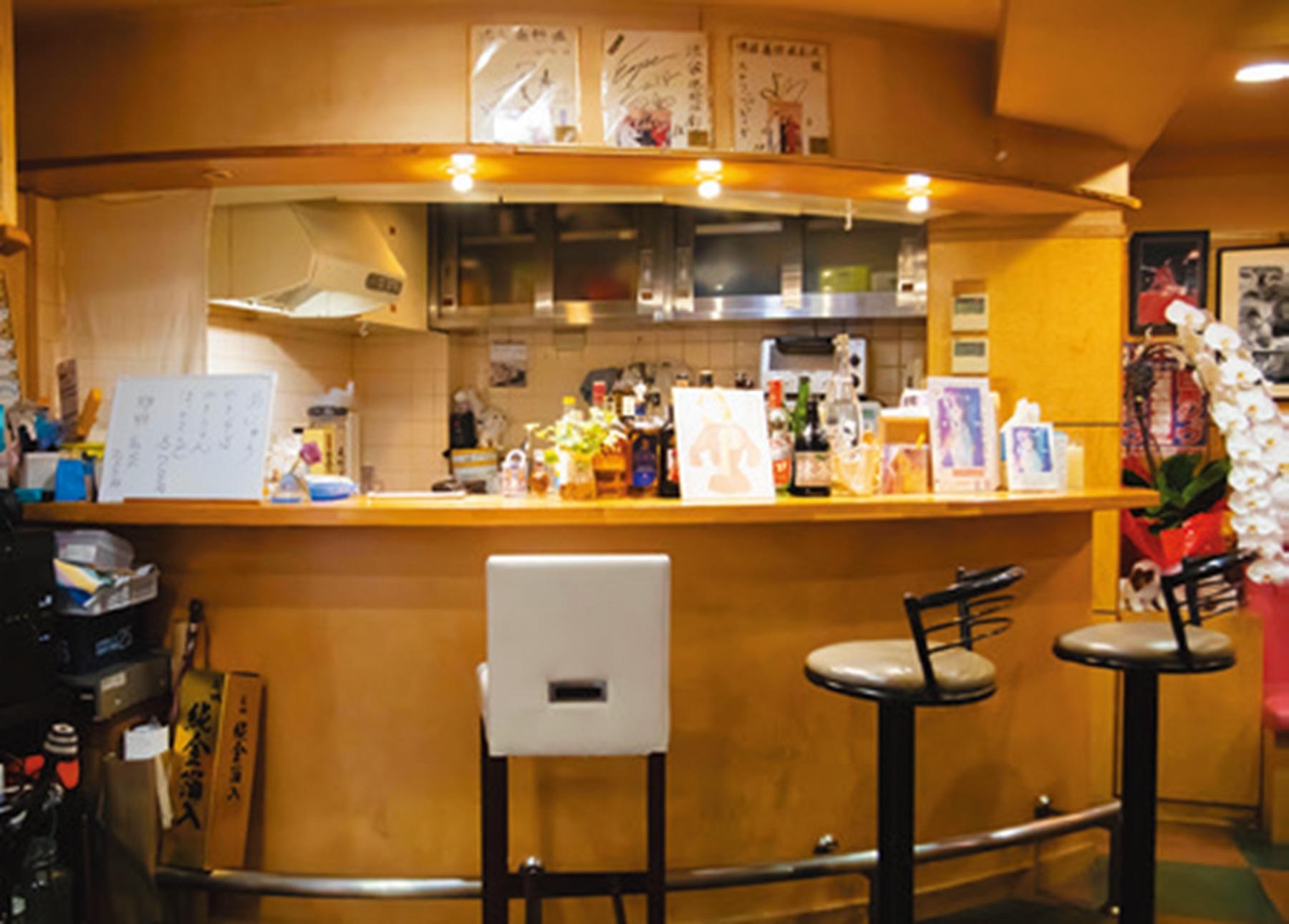 ショーを観ない時間は本を読んだりと自由に過ごそう。劇場のロビーではお酒やジュースなどのドリンクはもちろん、やきそばやホットサンド(各¥700)などの食事メニューも楽しめる。壁に飾られている岡藤さんの色紙もチェック!