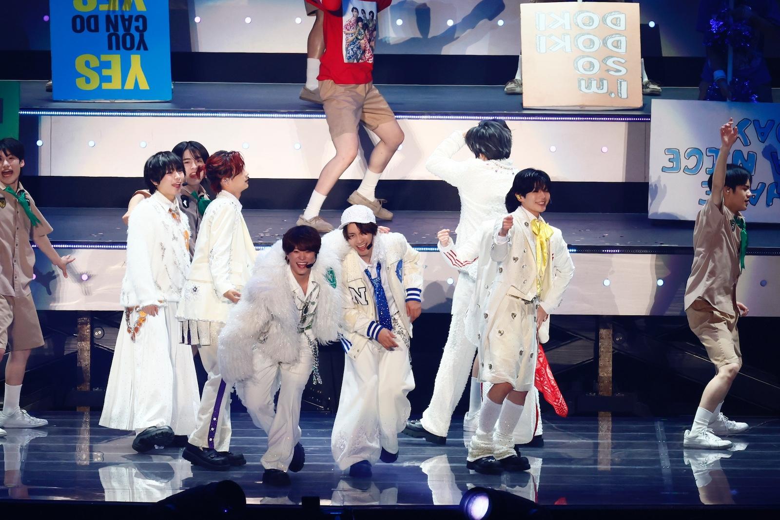 「勇気100%」では、「今回、関⻄ジュニアの⼦たちも僕たちをサポートしてくれています。これから⼀緒に未来を作っていく⼦たちなので、覚えてあげてください!」と⻑尾さんが紹介すると、伊藤篤志さん、池川侑希弥さん、⾓紳太郎さん、丸岡晃聖さん、北村仁太郎さん、中川惺太さん、⻲井海聖さん、嵜本孝太朗さん、⽥所蒼⼤さん、⻄野統真さんら総勢50名の関⻄ジュニアがステージに現れて、全⼒で元気にパフォーマンス!