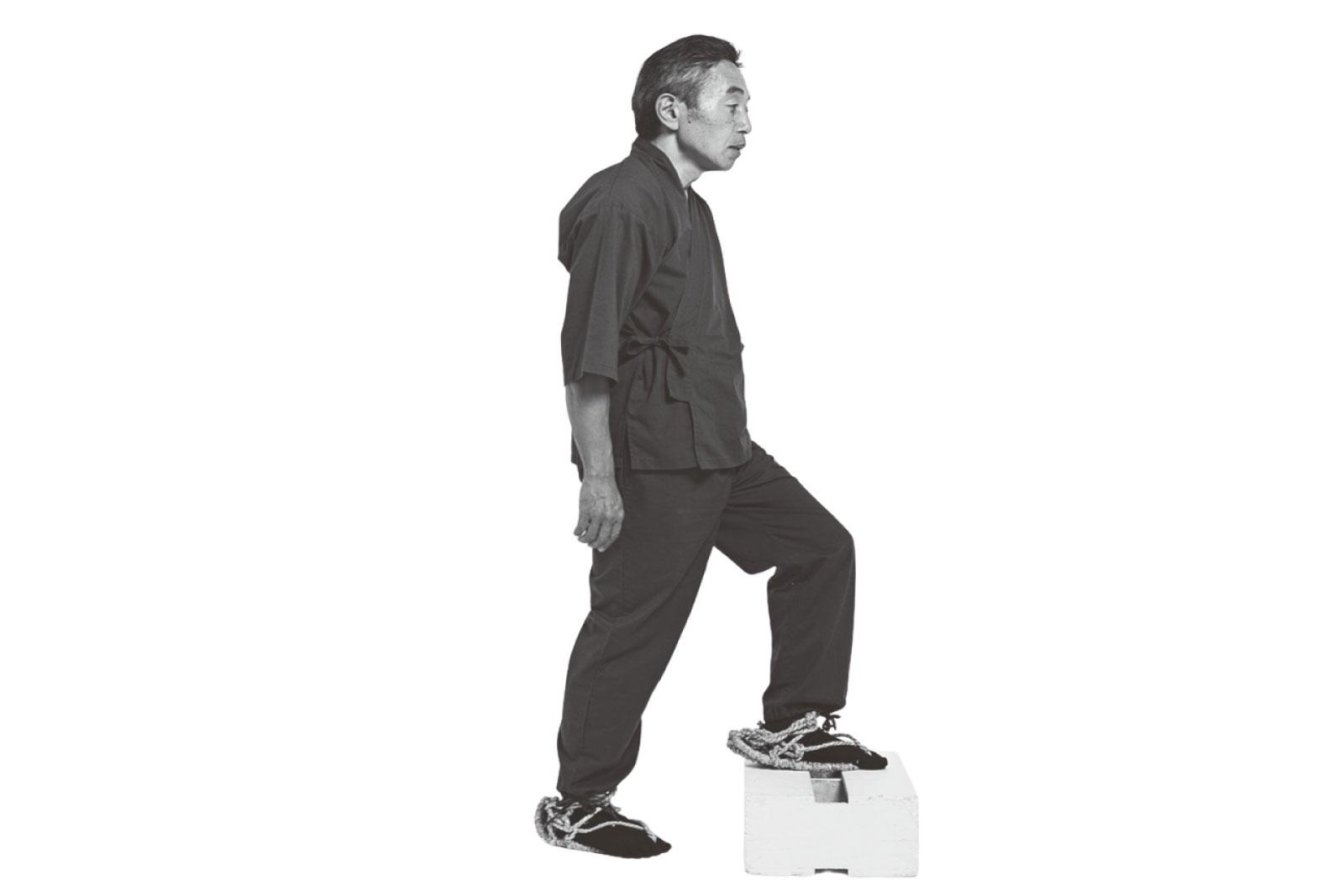 膝を軽く曲げてつま先重心で立つ。/「江戸時代の人たちは、軽く膝を曲げてつま先で立つのが一般的な立ち方でした。これが江戸走りの基本姿勢になります」(大場さん)。まず腰を前に傾けて、前傾姿勢をキープ。膝を軽く曲げて、つま先立ちに。かかとは紙1枚程度浮かせる。※ 足指の付け根の上に膝が乗るように。