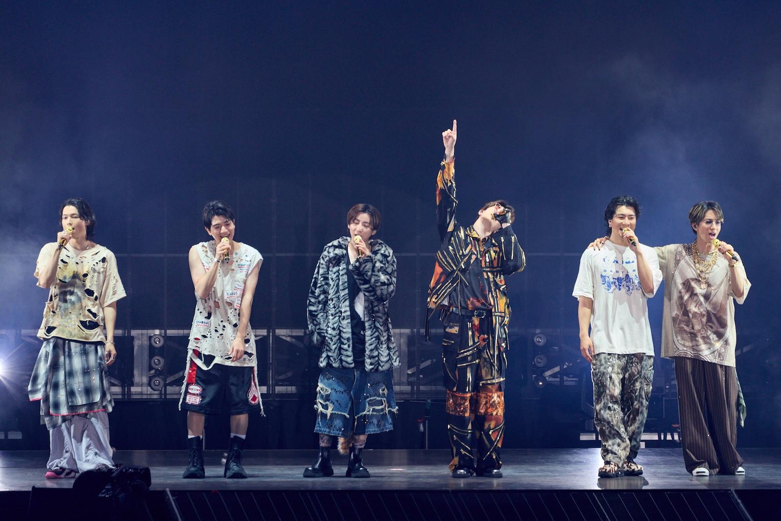 激しさは増していき、「Amazing!!!!!!」では、ダイナミックな特効で6周年をお祝い。スパークラーの炎が眩しく交差し、⾳⽟が怒涛の勢いでサクレツ。彼らの勢いを象徴するかのような演出に、会場のボルテージが最⾼潮に。「ついてきてくれて、ありがとうございます。今後もいろんな景⾊を俺たち6⼈と⾒ましょう」というジェシーさんの⾔葉で最後の曲「Stargaze」へ。眩しい真っ⽩な光に包まれる中、横⼀列になって歌う6⼈。野⽥洋次郎さん楽曲提供のこの曲は、もがき続ける今が輝いているという彼らの等⾝⼤ソング。ラストは光を照らすほうに姿を消して幕を閉じ、拍⼿と歓声に包まれる会場。