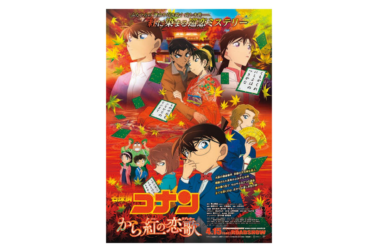 劇場版第21作『から紅の恋歌』2017年/大阪と京都を舞台に、百人一首にまつわる連続殺人事件が起こる。西の高校生探偵・服部平次がコナンと共に事件に挑む一方、平次の幼なじみで彼に思いを寄せる遠山和葉の前に、平次の婚約者を名乗る女子が登場?! クライマックス、バイクの後ろに和葉を乗せた平次が、「手ェ離したら…殺すで」と言ってジャンプする名場面が! Ⓒ2017青山剛昌/名探偵コナン製作委員会