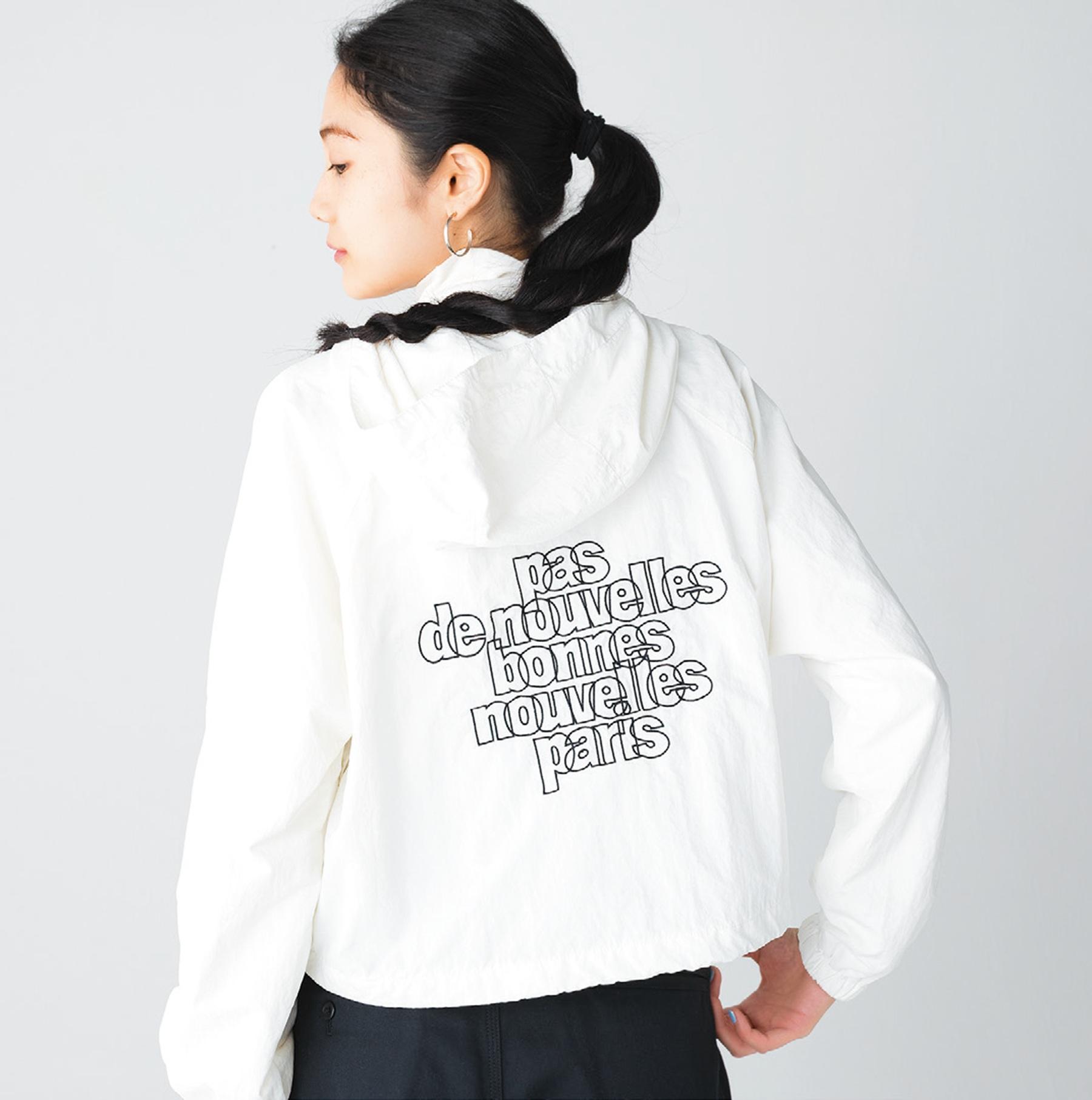背中のロゴプリントが目を引く軽やかなナイロンパーカ。ショート丈でハイウエストのボトムスやロングワンピとも好相性。裾のドローコードでシルエットの調節も可能。