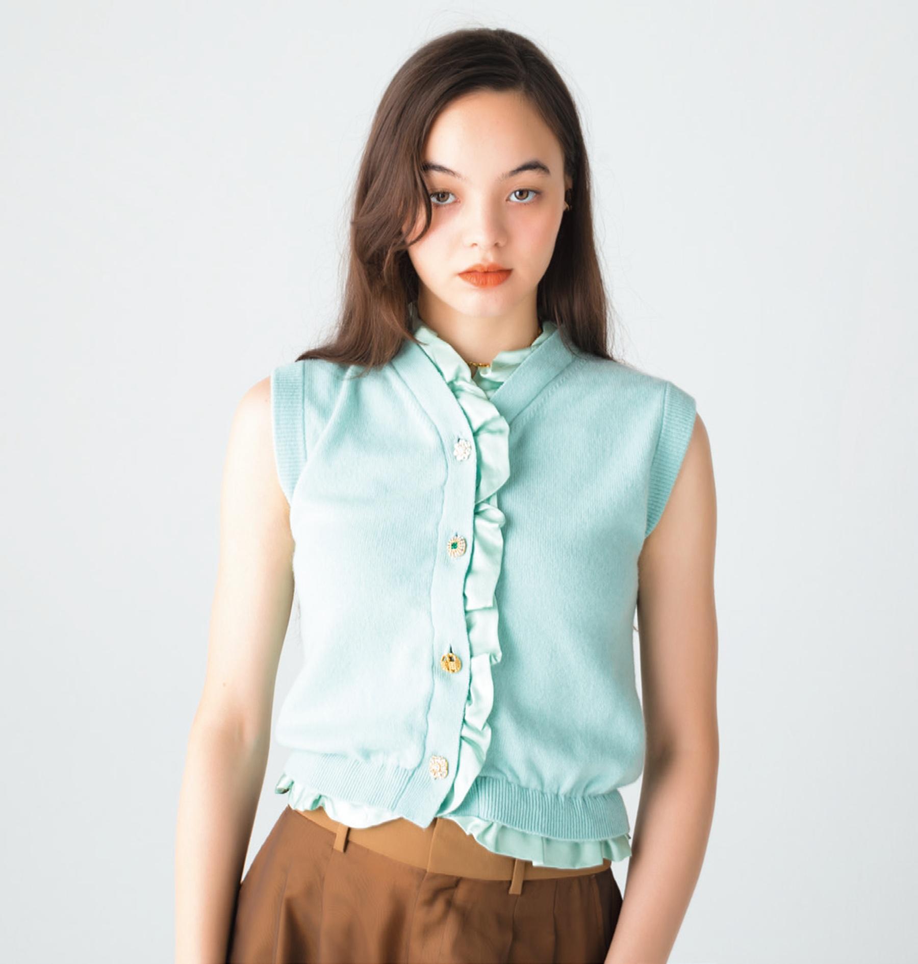 前立てや裾に付いたフリルが可愛らしい一着。4つそれぞれ種類が異なる、大ぶりなボタンにも注目。淡いミントカラーがコーディネートの差し色に◎。