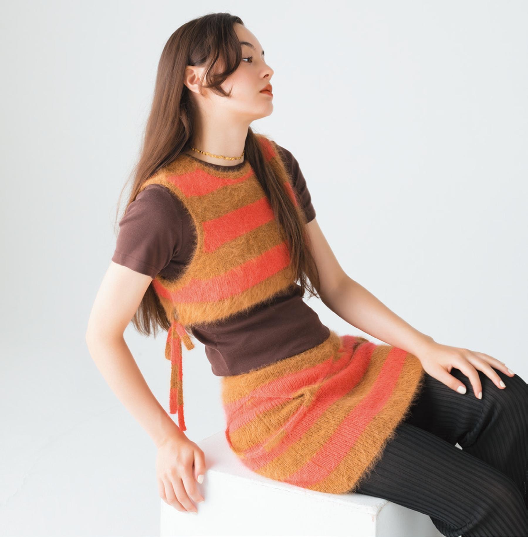 ふわっとしたモヘアの質感がコーディネートの主役に。サイドに付いた紐もポイント。