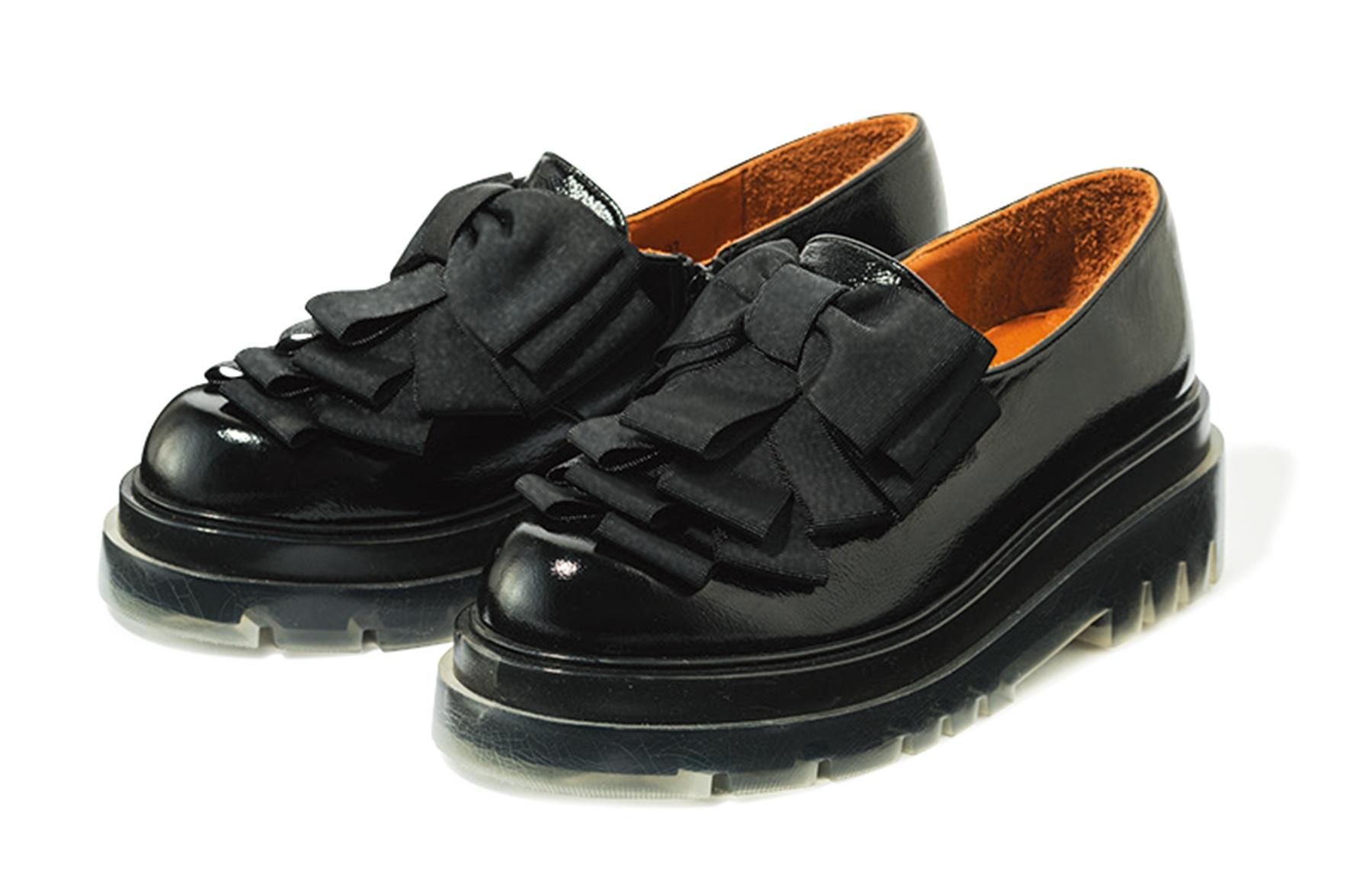 リボンディテールが目を惹く、艶やかなブラックレザーのローファー。厚底ソールがタフな印象ながら、可憐さも漂う秀逸デザイン。