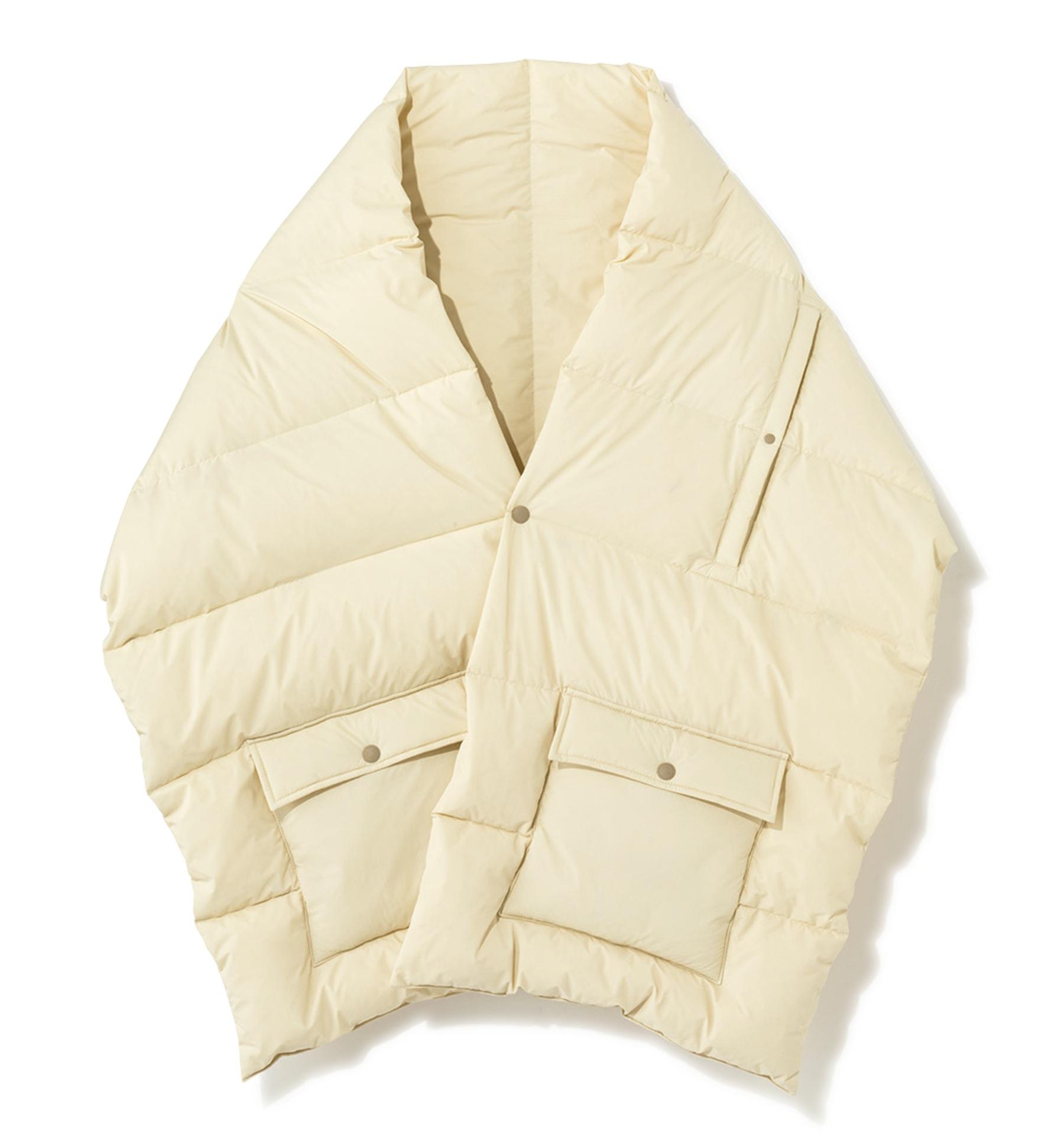 軽量で保温性に優れたダウンスカーフは、スリットから腕を通せばベストのように着用できる。透湿防水機能素材を使用。