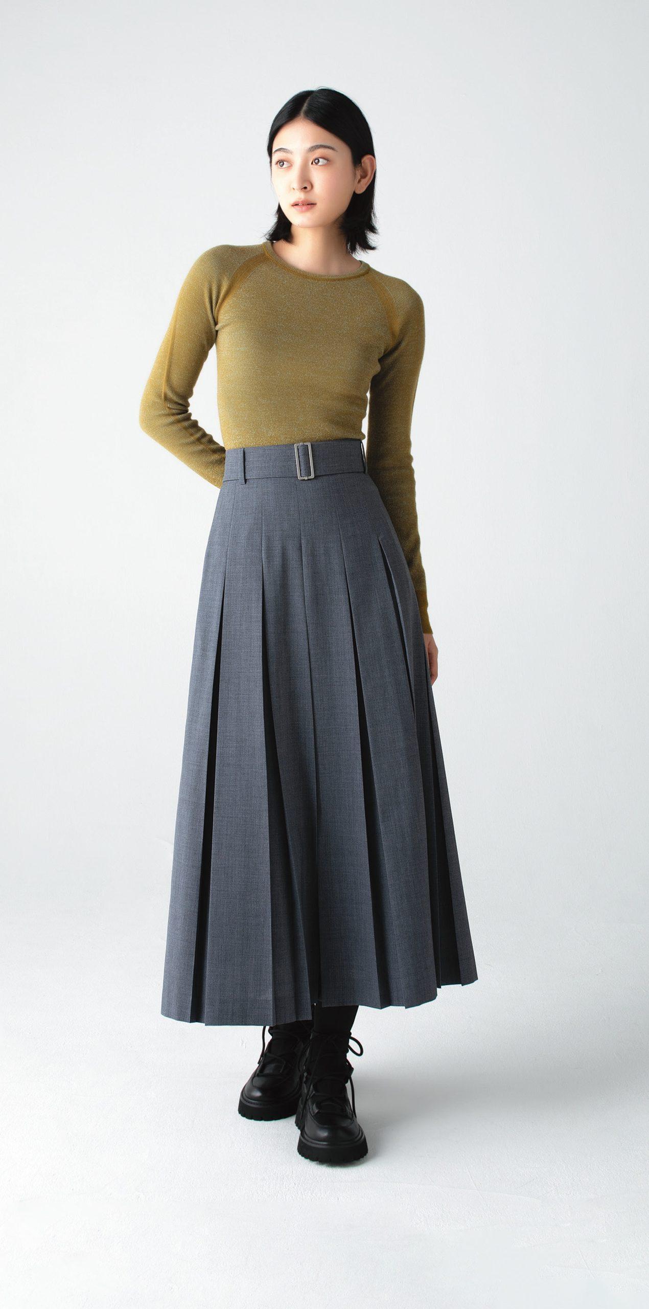 梳毛のウールとポリエステル混紡のドライタッチな風合いで、オールシーズン着回せるスカート。ベルト付きで脚長効果があり、ウエストまわりもすっきり見せてくれる。