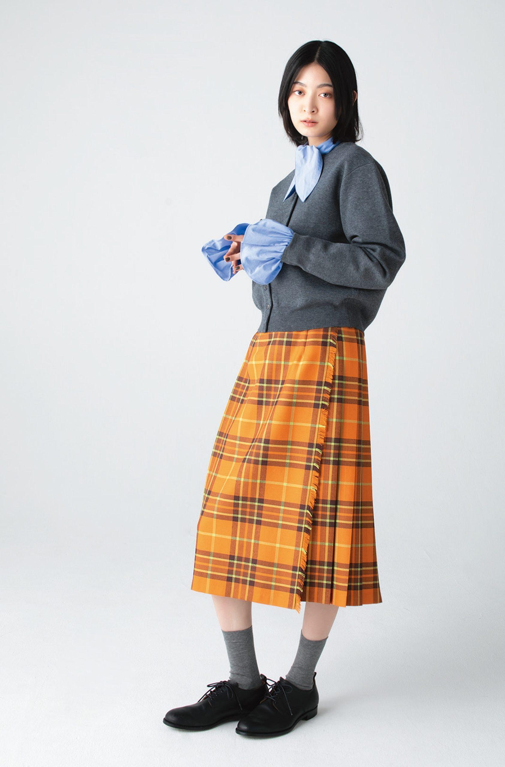 スカート¥33,000(オニール オブ ダブリン/ジャーナル スタンダード 自由が丘店 TEL. 03-5731-0128) カーディガン¥15,950(ビューティー&ユース/ユナイテッドアローズ 渋谷スクランブルスクエア店) シャツ¥41,800(ジェーン スミス/ジョン メイソン スミス ジェーン スミス ストア TEL. 03-6721-9448) 靴¥83,600(マーガレット・ハウエル TEL. 03-5785-6445)