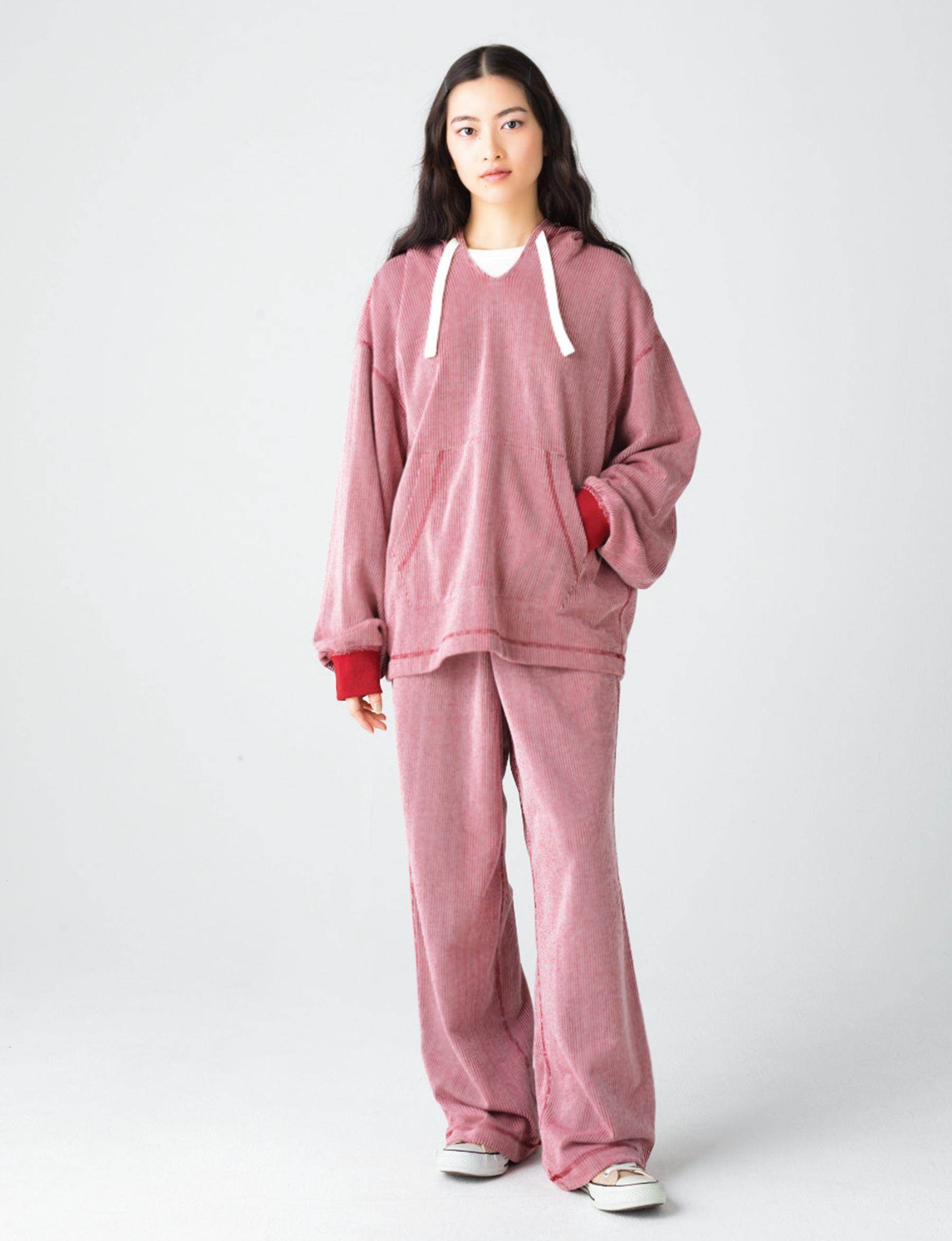 オーガニックコットン混紡糸を丁寧に編んだ裏毛スウェットのパーカとパンツ。ふっくらと柔らかく、リラックスできる着心地。パーカ¥20,900 パンツ¥18,700(共にヘリーハンセン/ヘリーハンセン原宿店 TEL. 03-6418-9669) ロンググスリーブTシャツ¥12,100(テイクス/シンゾーン ルミネ新宿店 TEL. 03-5909-4088)