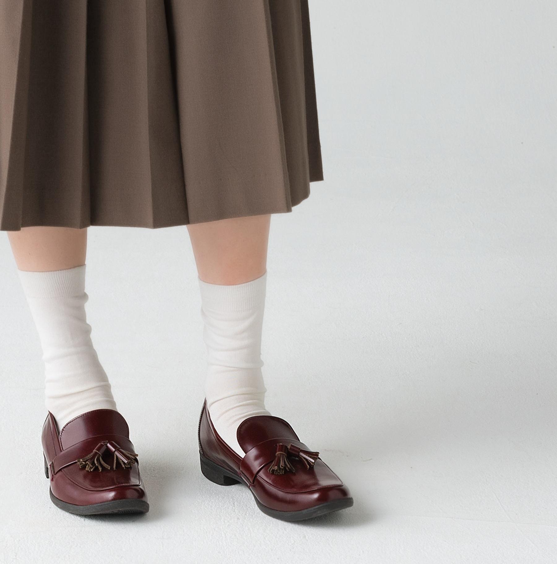 防水加工済みで軽量、靴袋付きで旅のお供に◎。靴 ¥31,900(マスター&コー×ショセ/マッハ55リミテッド TEL. 03-5846-9535) スカート ¥36,000(Uhr/Uhr Online Store) 靴下 ¥3,300(パンセレラ/真下商事 TEL. 03-6412-7081)