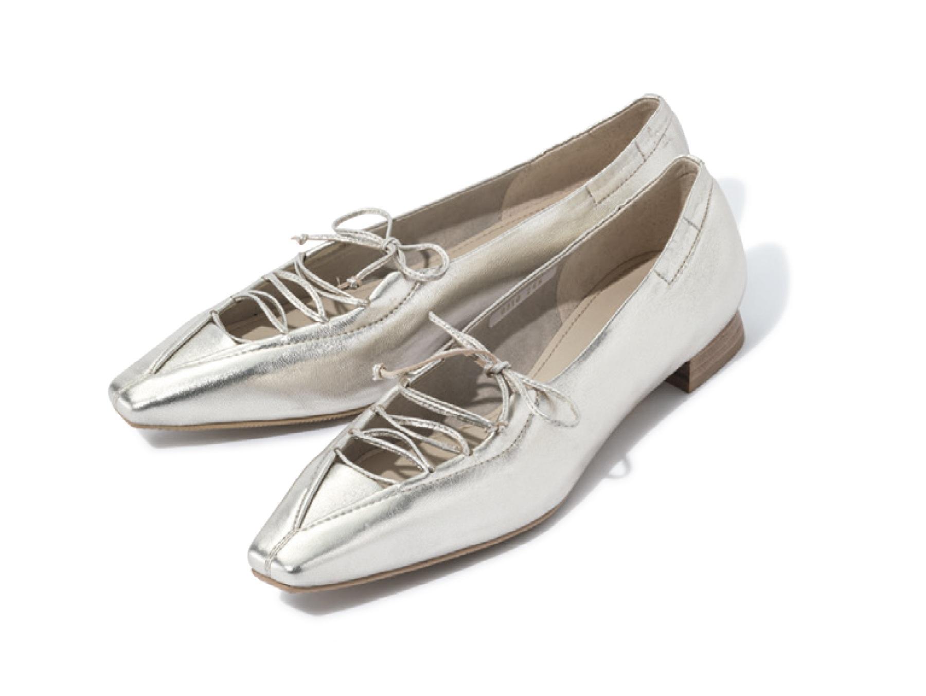 ④ シルバーのメタリックな輝きが足元をエレガントに演出