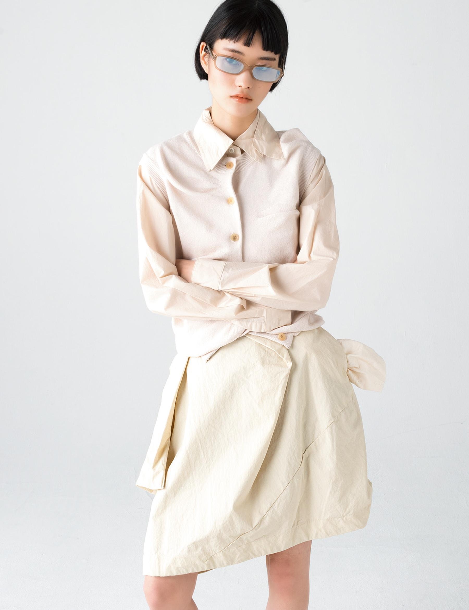 シャツの2重襟や飛び出したポケットなど随所に遊び心が。ベスト ¥39,600 シャツ ¥47,300 スカート ¥89,100(以上ピリングス/リトルリーグ インク TEL. 0800-300-1291) サングラス ¥30,900(ジェントルモンスター/エム TEL. 03-6721-0406)