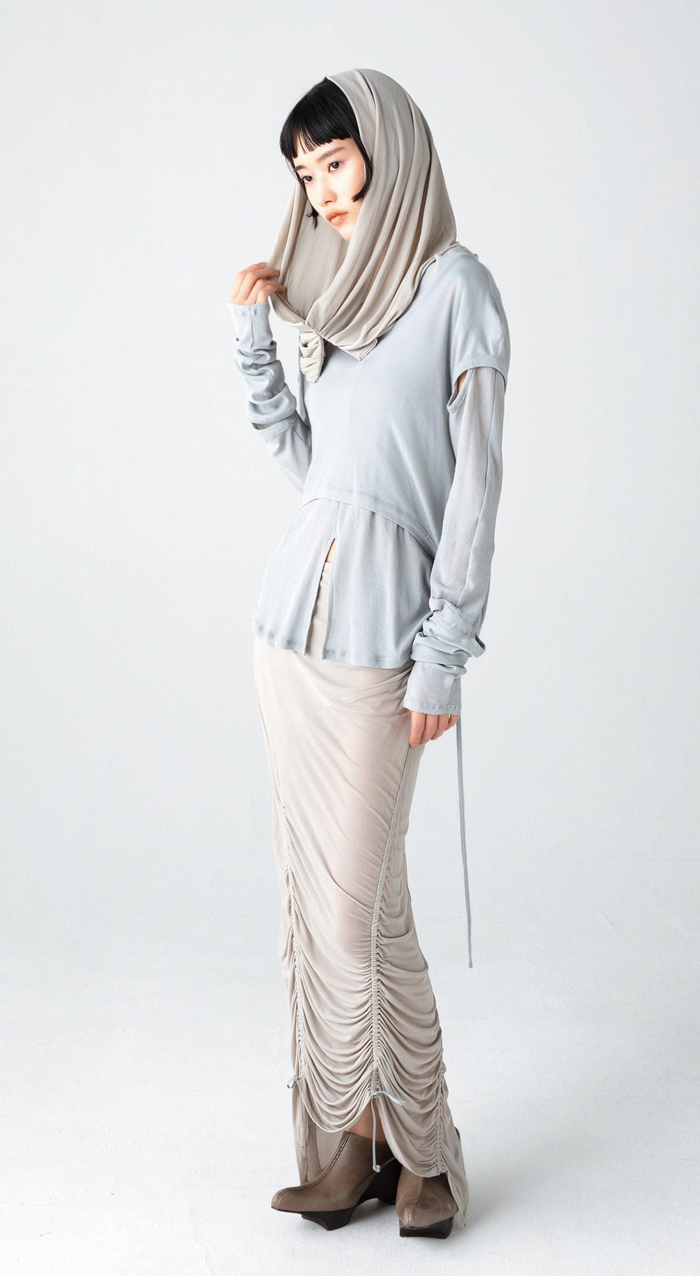 ギャザーやドレープが生む、動きのある表情に今っぽさが映えるスタイリング。重く見えがちなレイヤードも、ソフトな色合いで統一すれば軽やかな印象に。ヒジャブとスカートはストレッチの利いた素材で、肌に吸い付くようなタッチが魅力。いずれも、中国にルーツのあるデザイナーが手掛ける新進気鋭ブランドより。トップス ¥24,200 中に着たカットソー ¥29,700 スカート ¥46,200 ヒジャブ ¥24,200 シューズ ¥69,300(以上ムッシャン/サカスピーアール TEL. 03-6447-2762)