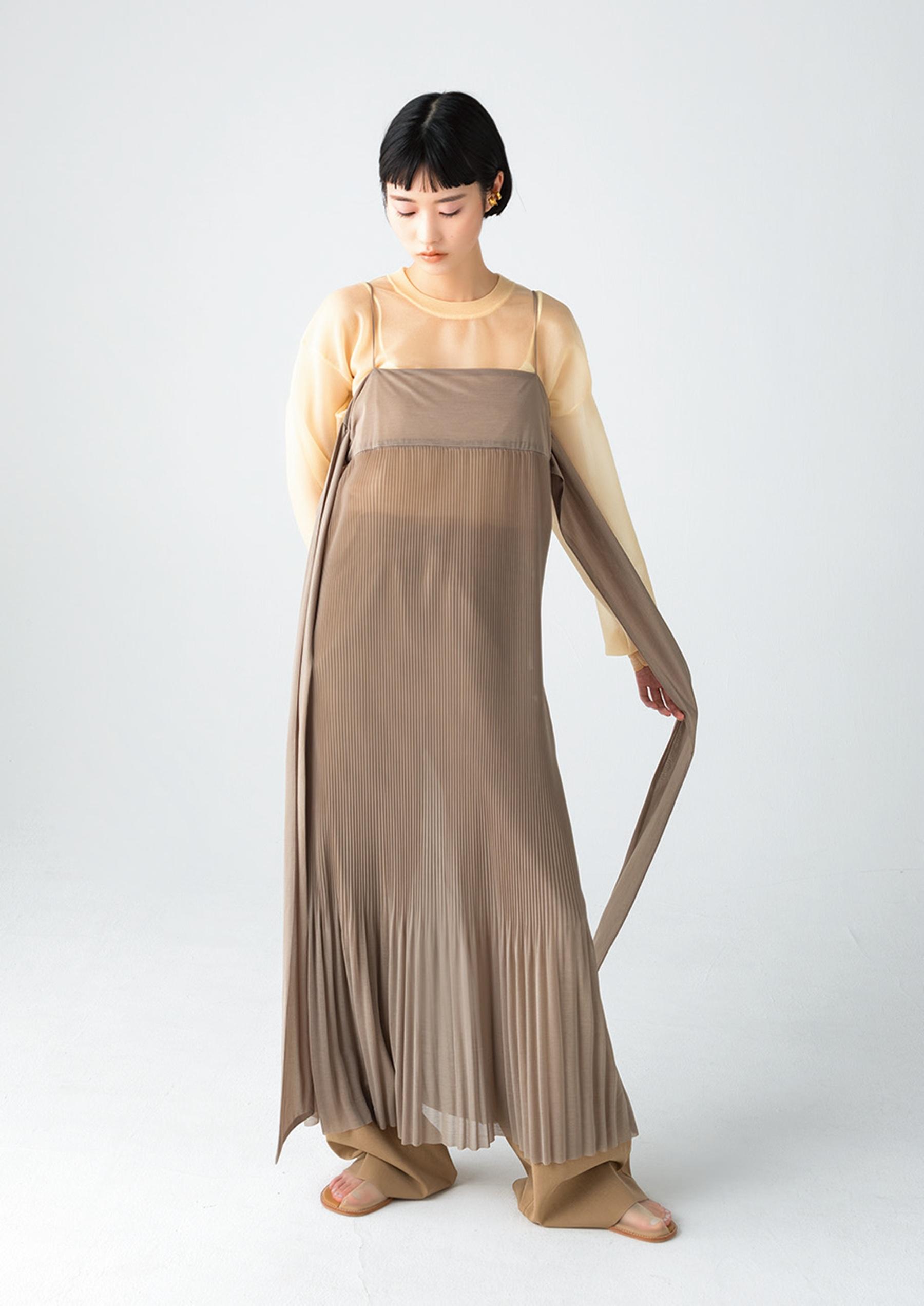 サイドに長く垂らした紐は、前や後ろで結んだりとアレンジ自在。ドレス ¥30,800 トップス ¥28,600 パンツ ¥29,700(以上ハイク/ボウルズ TEL. 03-3719-1239) サンダル ¥45,100(フミエタナカ/ドール TEL. 03-4361-8240)