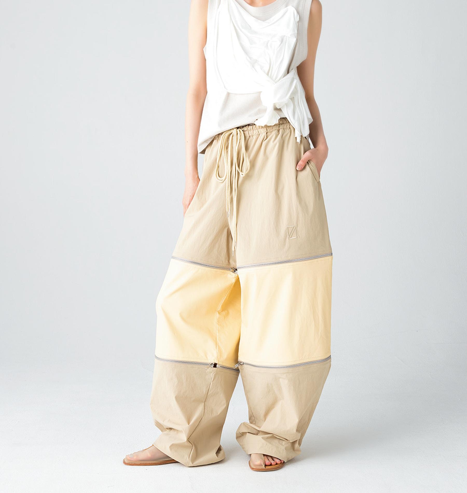 ベージュ×イエローの配色がポイント。ナイロンとレザーの切り替え部分はファスナー仕様で、ショート、ミドル、ロングの3段階に丈を変えることができる。パンツ ¥35,200(プレステージ アパレル TEL. 03-5458-7431) トップス ¥30,800(クリエイトクレイル/ザ・PR info@theinc-pr.com)