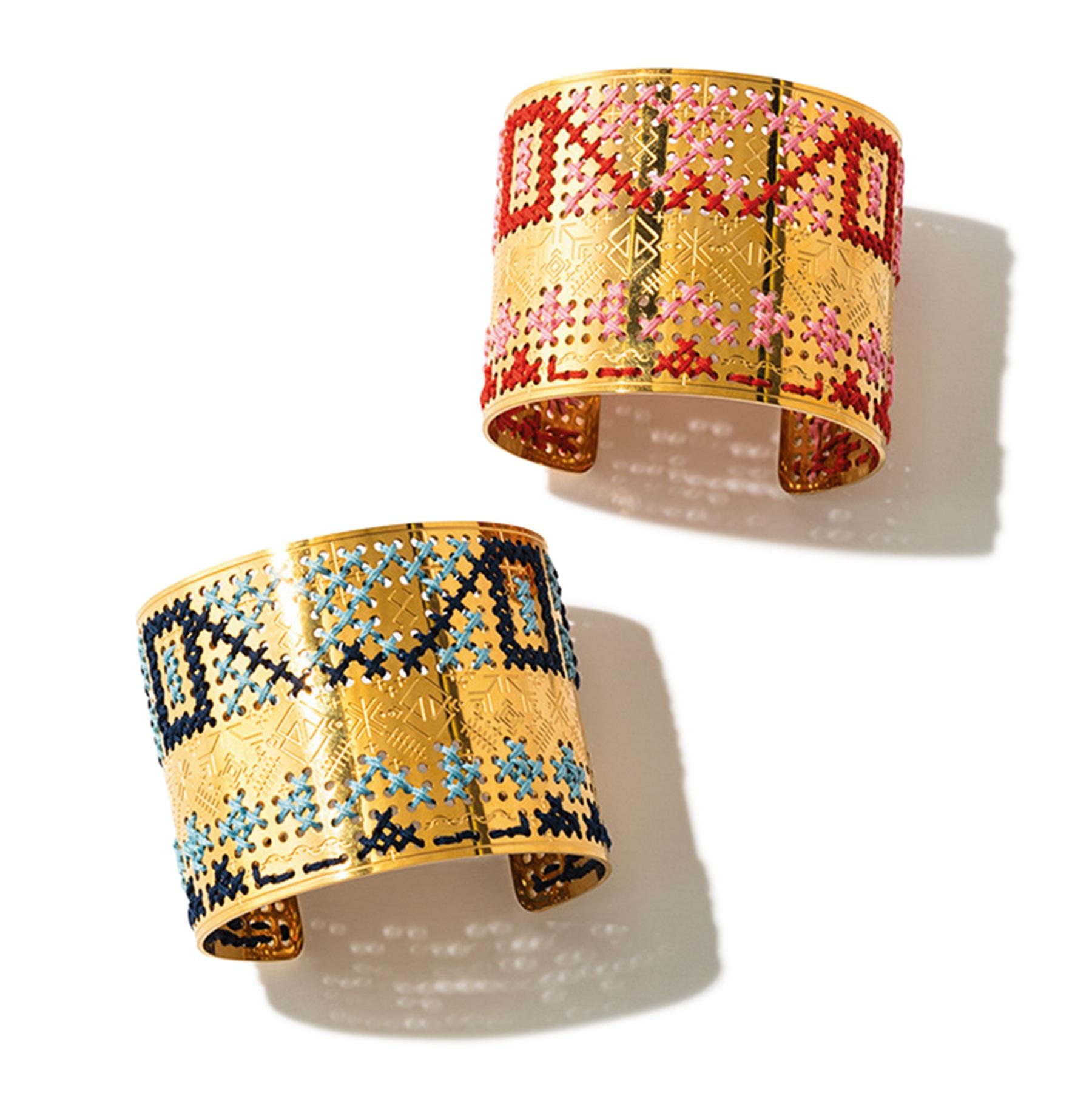あらかじめ穴を開けたベースに、一つひとつ丁寧に刺繍を施したバングル。イタリア・ボローニャ生まれのジュエリーブランドのもの。 各¥39,600(レイト・スタジオ/ズットホリック)