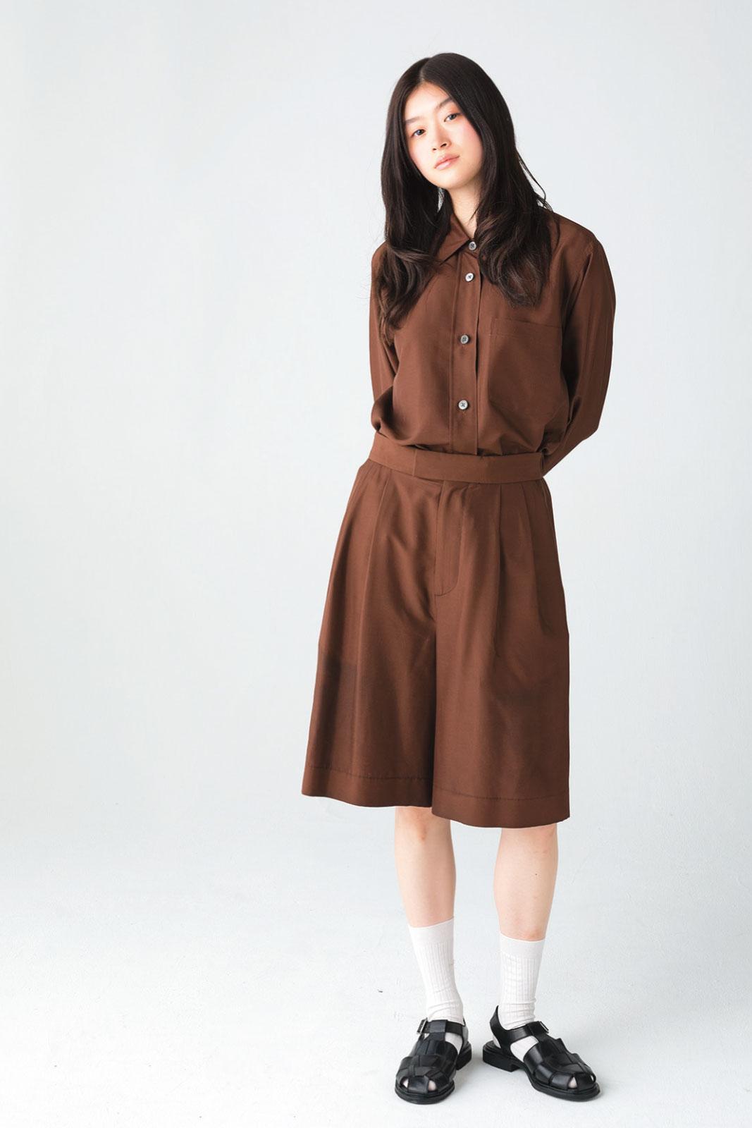 フロントのタックが生む立体感が、上品な印象を与える。ハーフパンツ ¥35,200(ヨーク/エンケル TEL. 03-6812-9897) シャツ ¥11,000(ジャーナル スタンダード レリューム/ジャーナル スタンダード レリューム ルミネ新宿店 TEL. 03-5909-4675) 中に着たカットソー ¥12,980(ビームス ジャパン/ビームス公式オンラインショップ) ベルト ¥28,600(ジェーン スミス/ジョン メイソン スミス ジェーン スミス ストア)