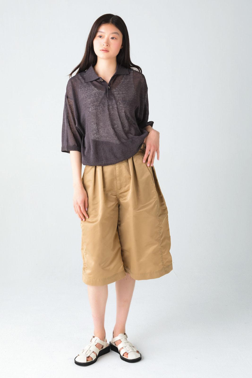 程よいハリのある生地が立体的なシルエットを生む。ハーフパンツ ¥29,700(Uhr/Uhr Online Store) ポロシャツ ¥31,900(ジェーン スミス/ジョン メイソン スミス ジェーン スミス ストア) サンダル ¥33,000(オデットエ オディール/オデット エオディール 新宿店 TEL. 050-8893-4165)