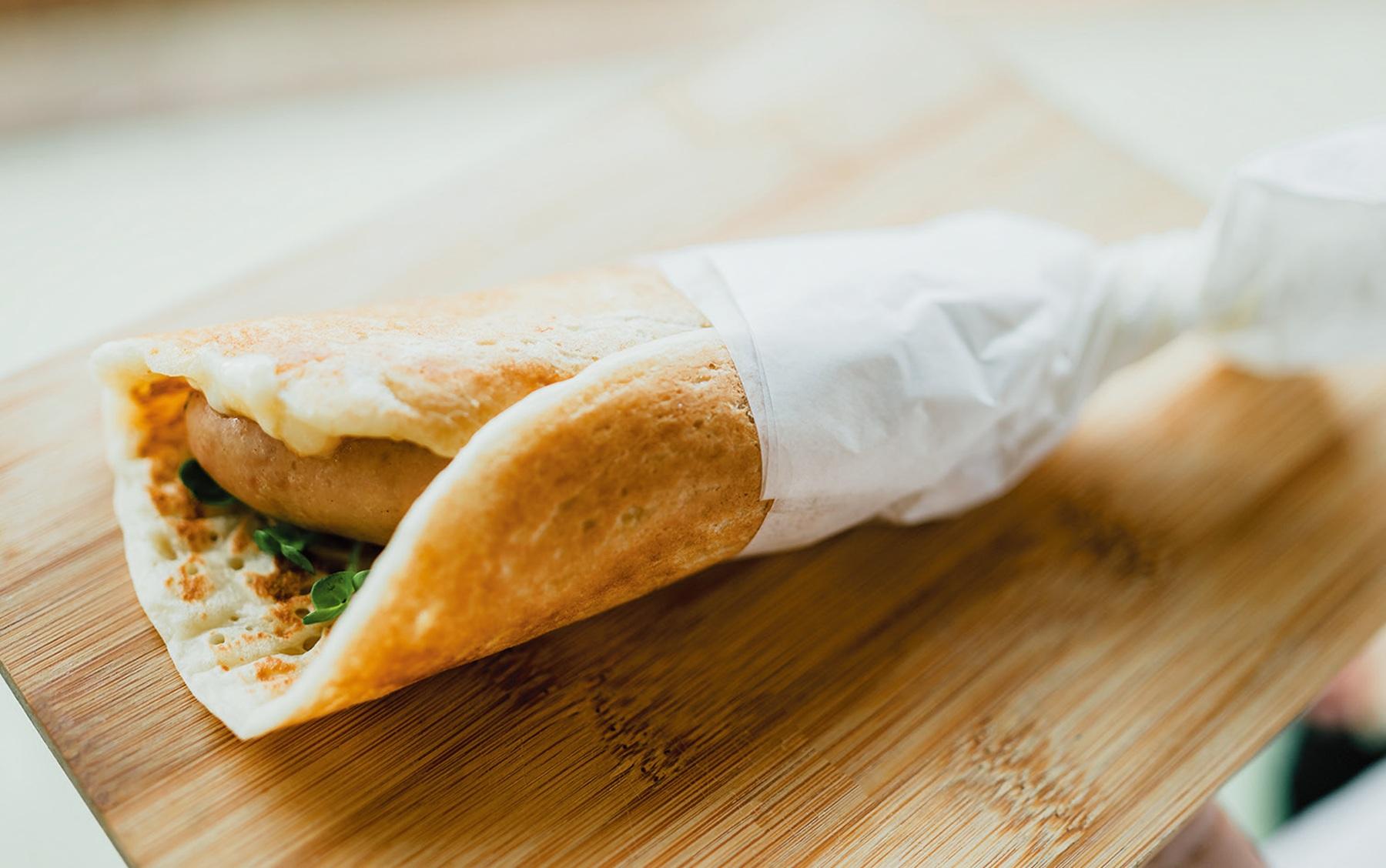 行列の絶えないテイクアウト専門店。グランドメニューは秩父みそに漬けた自家製のみそ豚を使ったソーセージを、モチモチのガレット生地で挟んだ「みそ豚ガレドッグ」(レギュラー¥670)。みそ麹が深い味わいを生む贅沢なフィンガーフード。