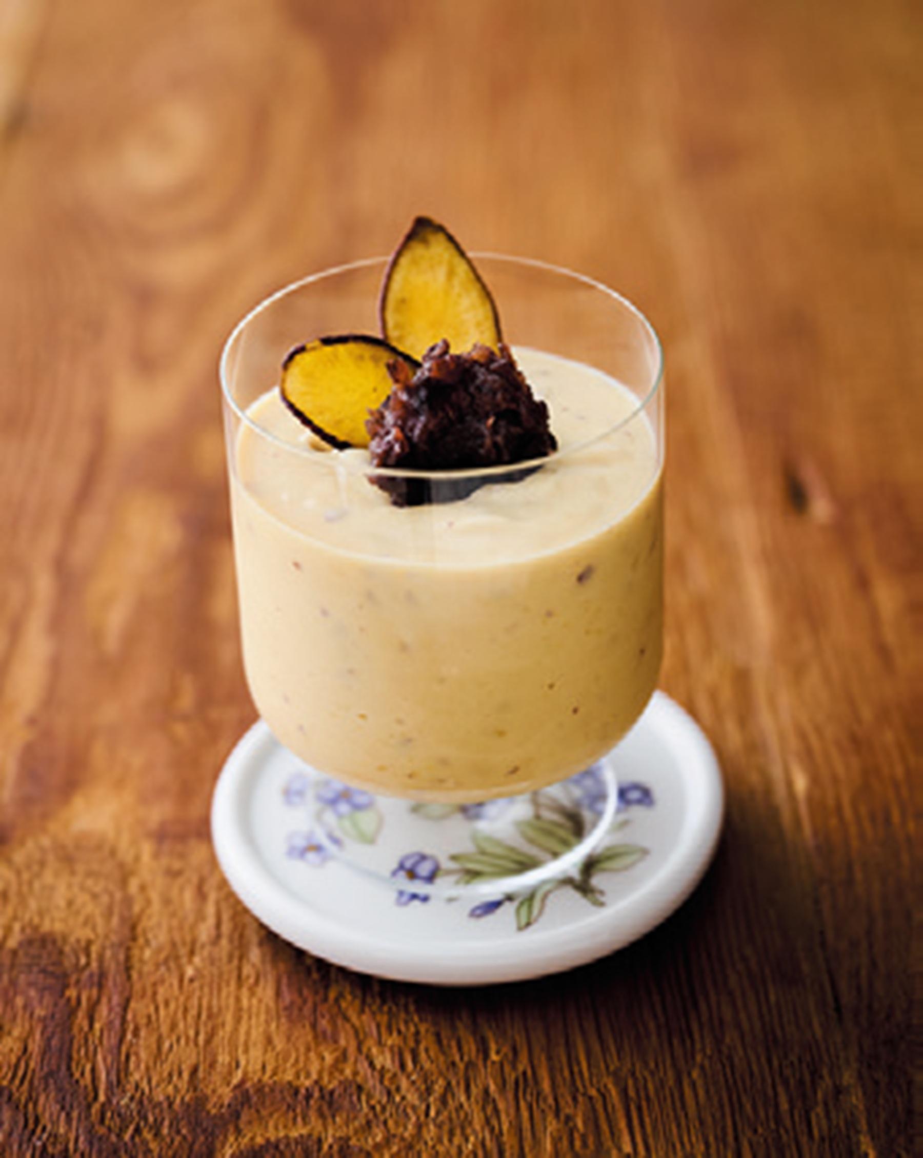 プレーンヨーグルトと焼き芋をミキサーにかけ、つぶあんペーストとさつま芋チップスをのせて完成。