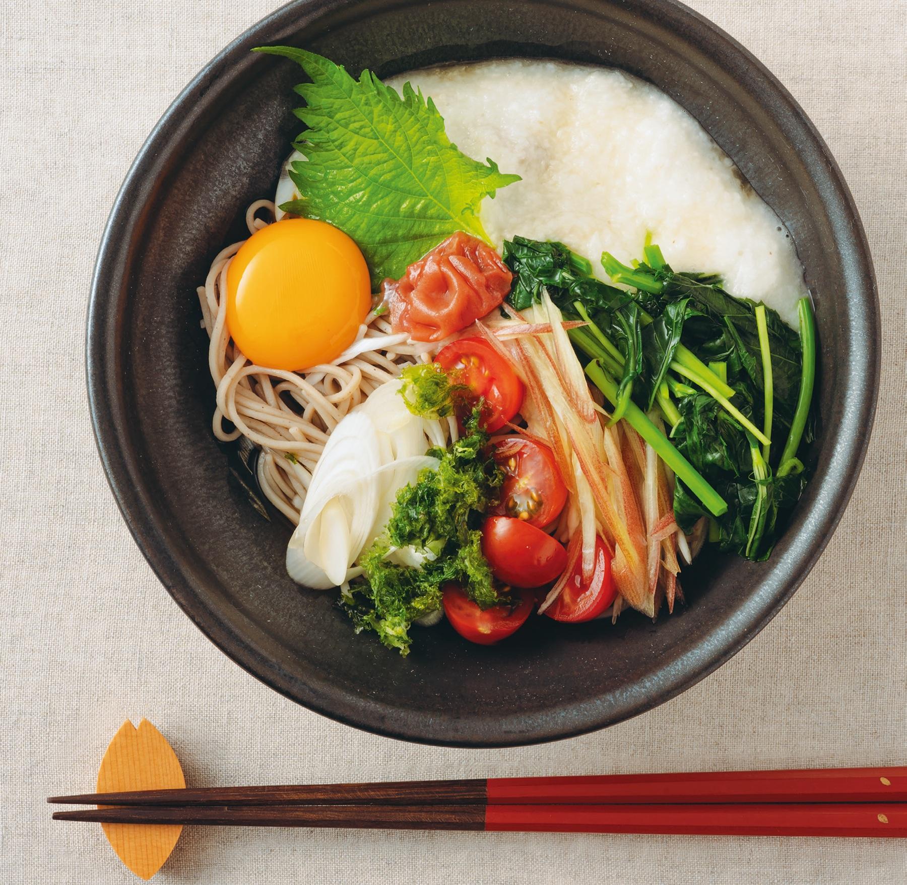 十割そば(乾麺)…100g、モロヘイヤ…2~3茎、卵黄…1個分、長芋…6cm、ミニトマト…3~4個、梅干し(種は取る)…1/2個、大葉…1枚、長ねぎ、茗荷、あおさのり…各適量、めんつゆ…30ml