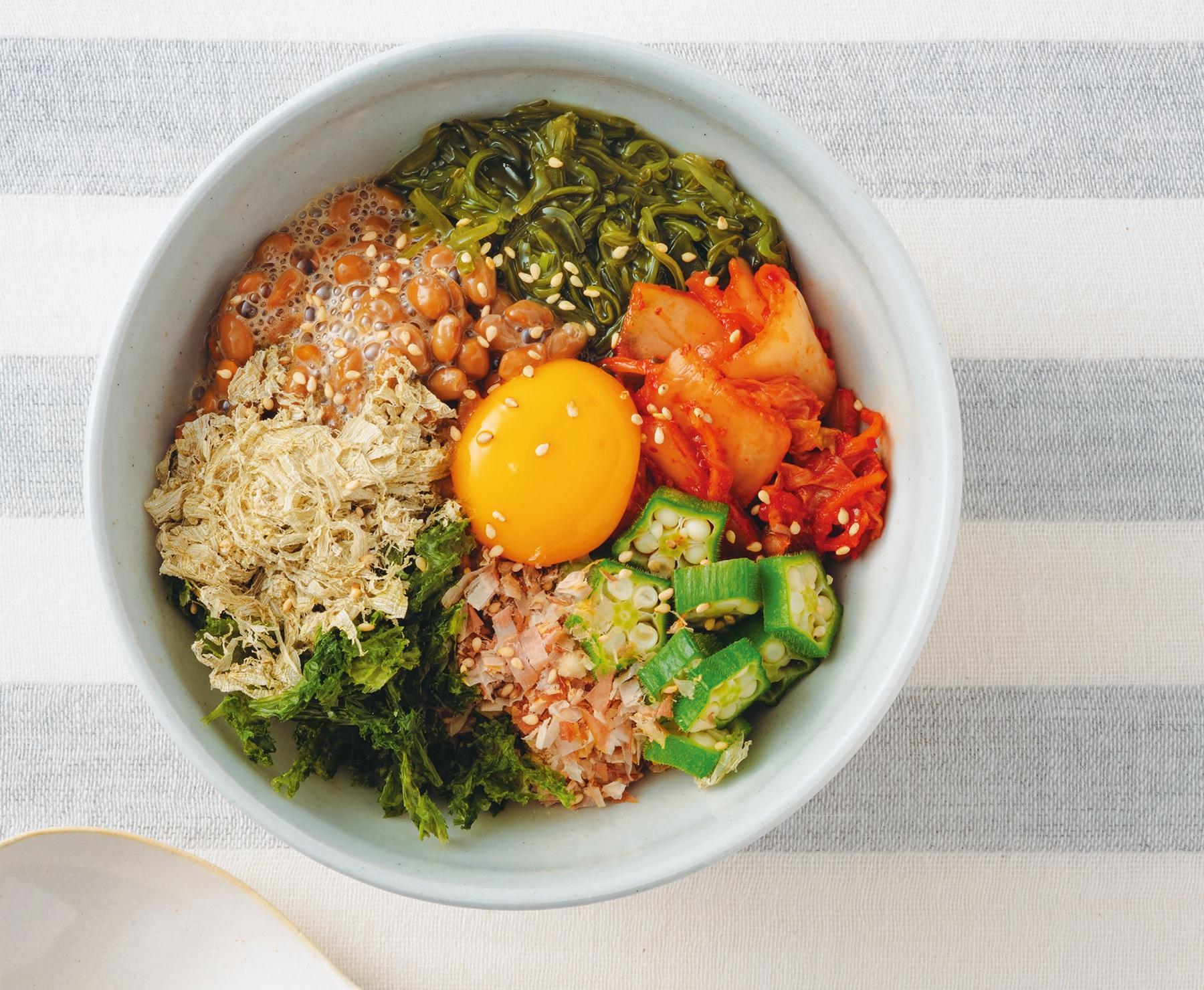 納豆…1パック(しょうゆまたはタレと混ぜる)、めかぶ…1パック、オクラ…1本、卵黄…1個分、とろろ昆布、キムチ、あおさのり、鰹節、白炒りごま…各適量、ご飯…お茶碗1杯分