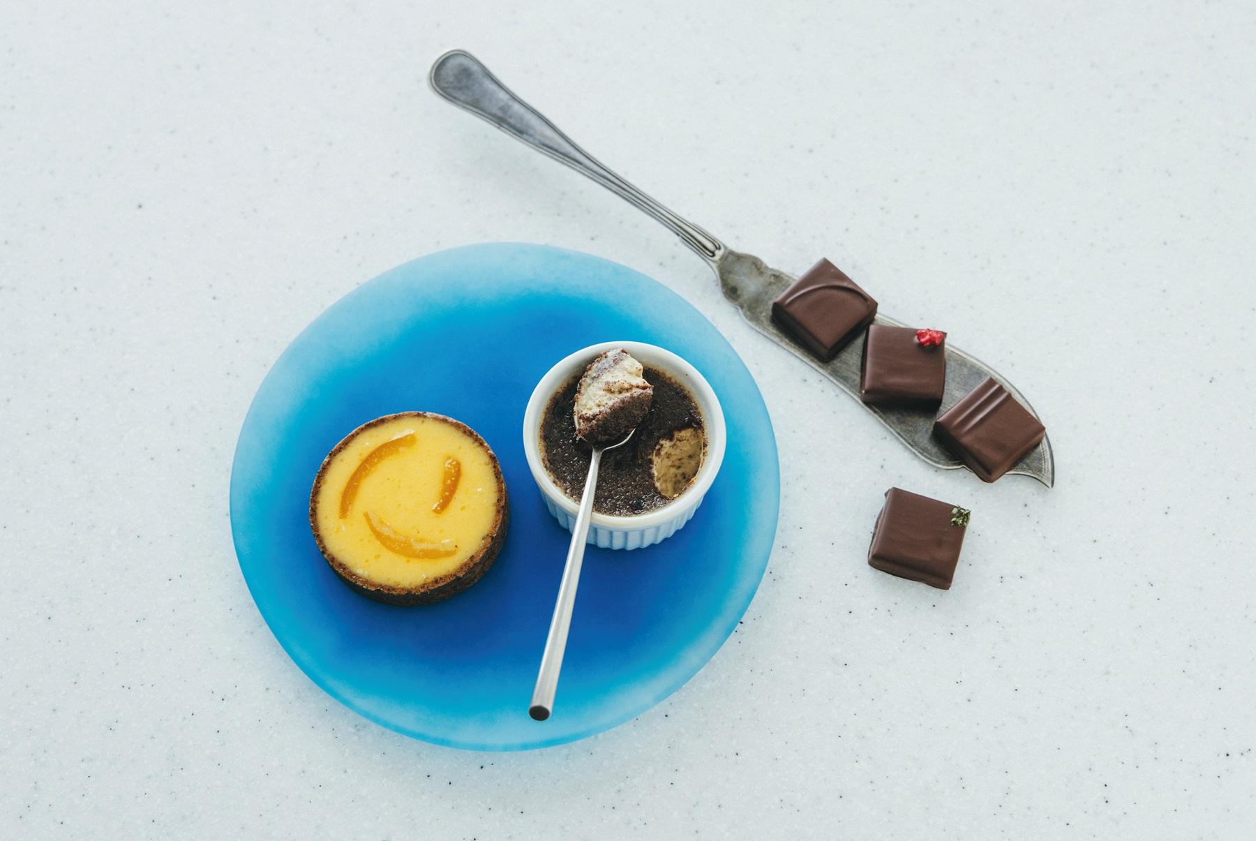 左から、「レモンタルト」648円、エクアドル・サモラチンチペ産の穏やかな風味のハスクを使った「カカオブリュレ」(648円)は、ハスクが洋酒のように芳醇。「ボンボンショコラ 4個入り」2916円。ライム、レモンと3種のフレッシュハーブのほか、マダガスカル産カカオを使ったラズベリー、インド産カカオで仕立てたパッションフルーツ、ガーナ産カカオにバナナとスパイスを合わせた一粒が収まる。