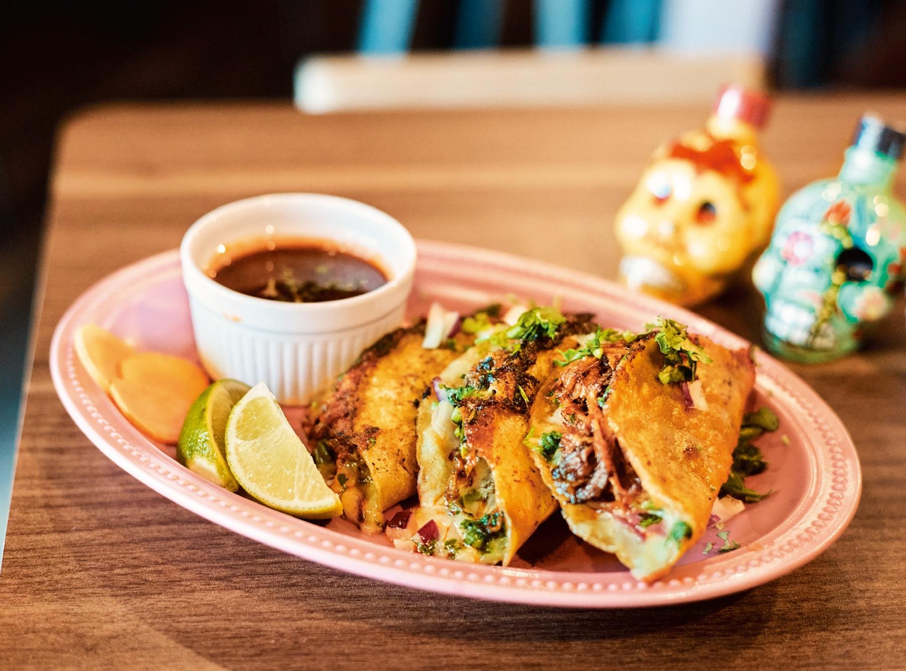 スポーツ観戦ができるタコス店。看板メニューは、牛肉とチーズをたっぷり挟んだタコスをピリ辛のスープにつけて食べる〈ビリアタコス〉1ピース¥650。テキーラとの相性も抜群。「今年2月にオープンしましたが、最近の新店のなかでもビリアタコスはここが一番です。アメリカでもいま流行っているタコスで、ぜひ一度美味しい店で食べてみてほしいですね」