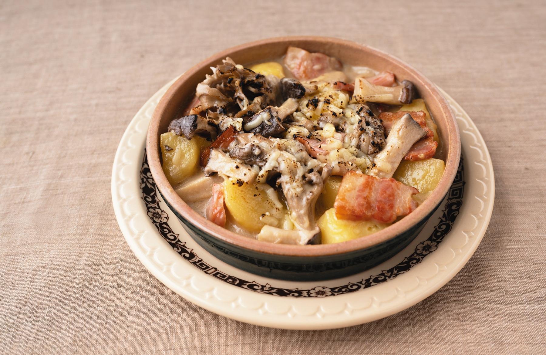 大きめのエリンギ、舞茸、じゃがいもが、食べ応えとおいしさを叶える。ビタミンD豊富なきのこが牛乳&チーズのカルシウム吸収を助け、栄養面でも理想のコンビ。ベーコンの塩気がアクセント。