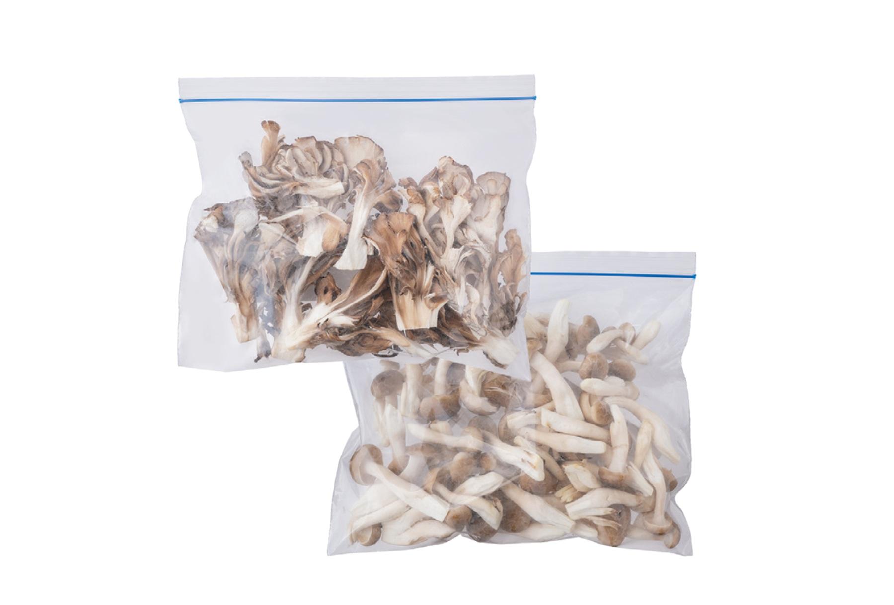 きのこは洗わずに、石づきを除き食べやすいサイズにして、ジッパーバッグに入れて冷凍。余裕がある時は、バットに並べて急速冷凍してから袋に移せば、余分な水分が飛んで、よりおいしく仕上がる。2週間で使い切るのがベスト。