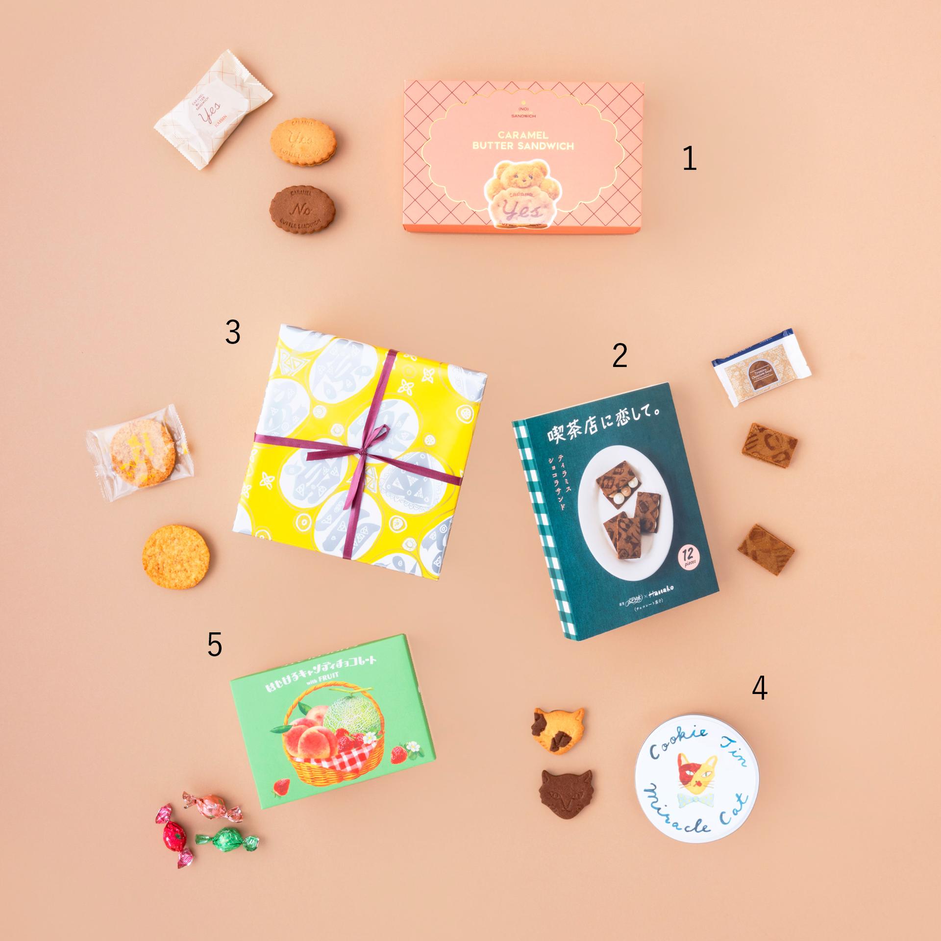 ① (NO) RAISIN SANDWICH「CARAMEL BUTTER SANDWICH」(8個入り¥2,980)、② 喫茶店に恋して。「ティラミスショコラサンド」(12枚入り¥1,620)、③ 三原堂本店「塩せんべい」(46枚入り¥2,600)、④ Fairycake Fair「神様のいたずらネコクッキー缶」(15枚入り¥2,700)、⑤ メリーチョコレート「はじけるキャンディチョコレートwith FRUIT」(33個入り¥3,024)