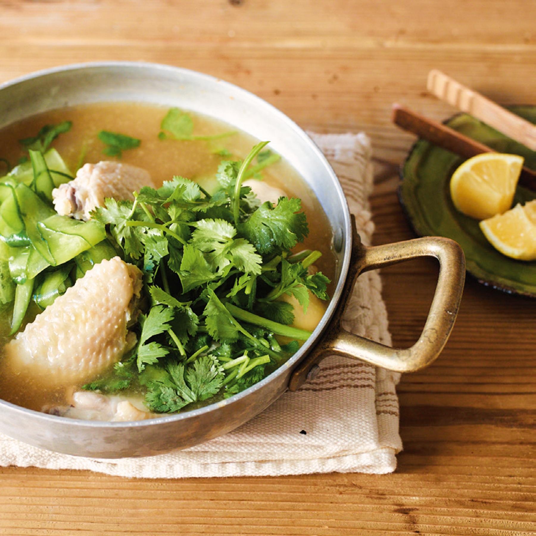 レモン鍋の素+ナンプラー…大さじ1、手羽先…8本、香菜…3株、きゅうり…2本、レモン…適宜