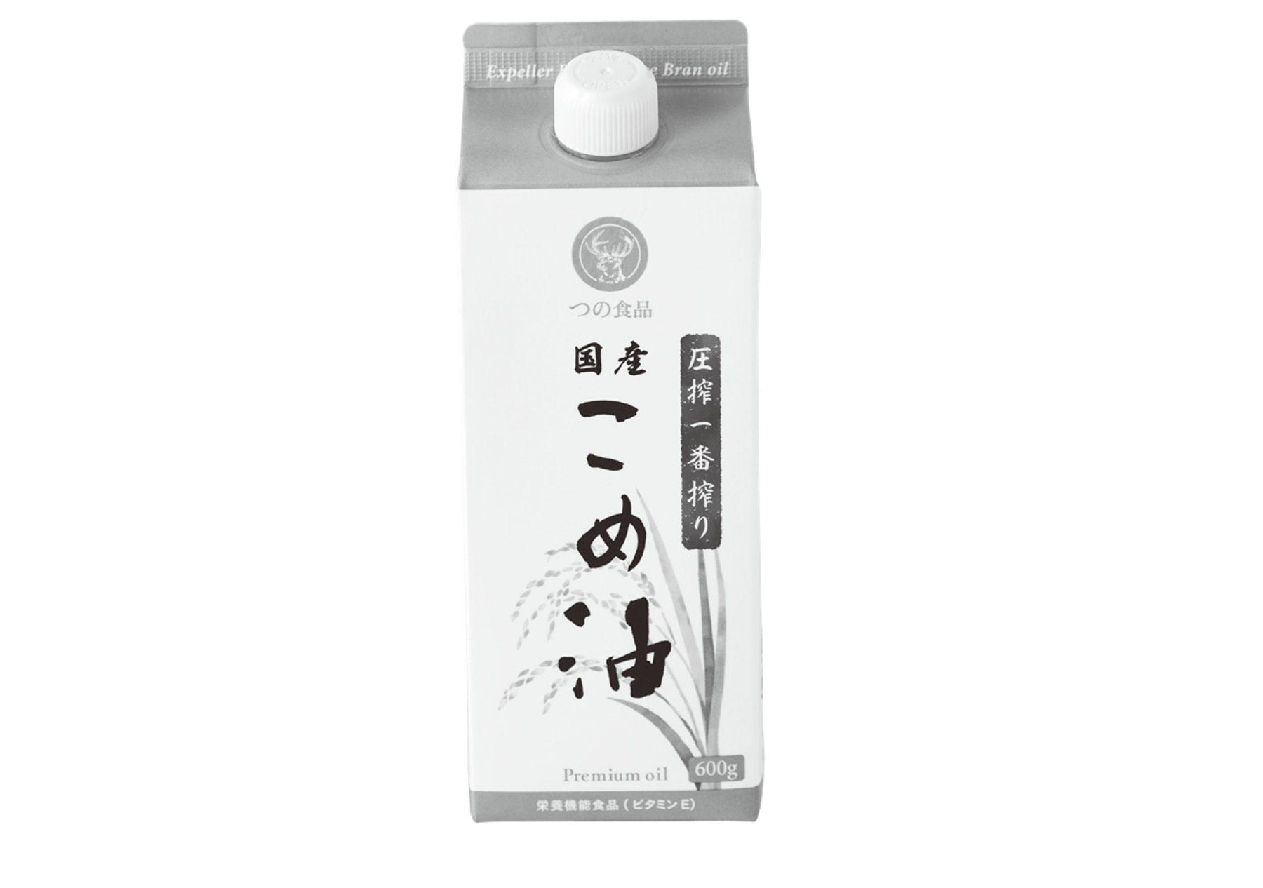 圧力のみで搾られた「圧搾一番搾り 国産こめ油 紙パック600g TSUNO」¥1,296。米ぬかの栄養成分「γ-オリザノール」の含有量が高く、大さじ1で1日に必要なビタミンEの半分以上が摂れる。