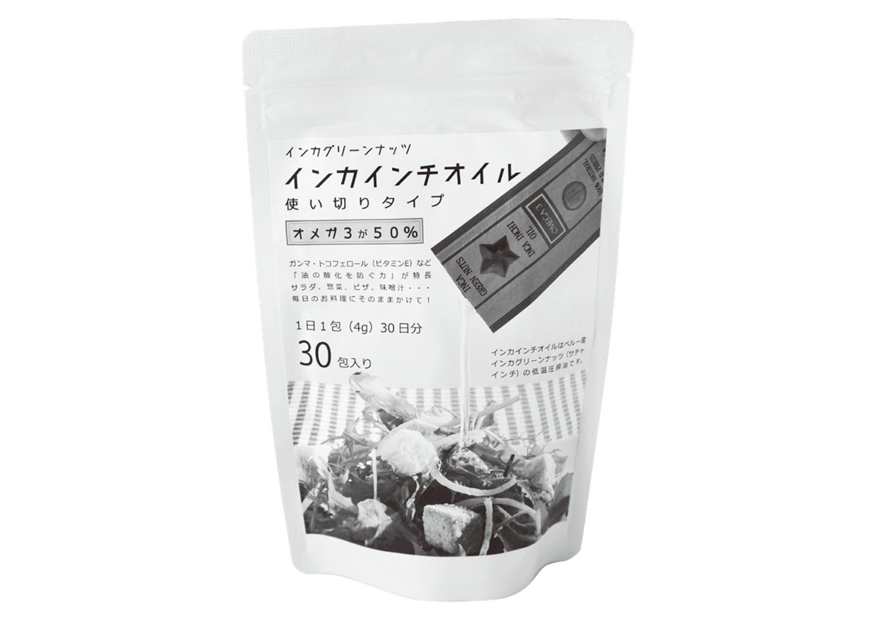 低温圧搾後、フィルターでろ過して不純物を取り除いた「【オメガ3+抗酸化ビタミンE】インカグリーンナッツオイル(インカインチ)」使い切りタイプ4g×30包パック¥1,836。個包装で酸化しにくい。