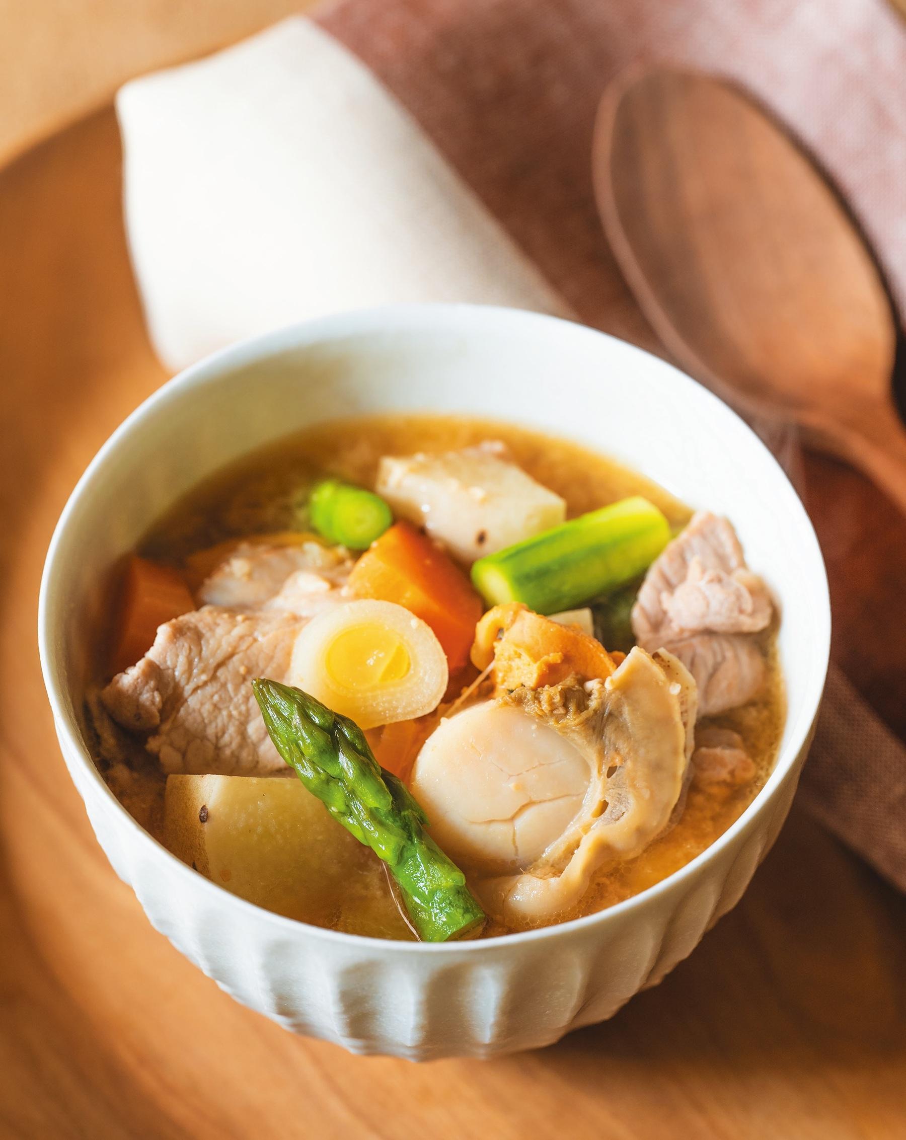 「これらは疲れた体にエネルギーと潤いを与えてくれる優秀食材です。長芋は皮自体にも『水』を動かす力があり、剥かずに使用するのがおすすめ。さらに抗酸化作用で体のサビを防ぎ、元気を与えてくれるニンジンや、新陳代謝を促し、利尿作用も期待できるアスパラガスで彩り豊かな豚汁に」
