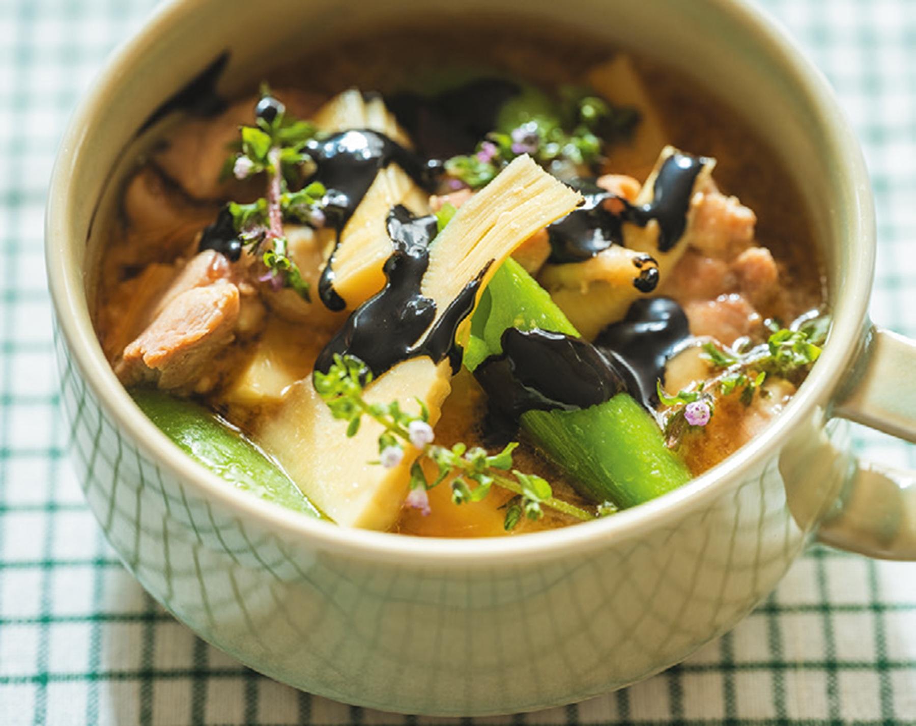 「タケノコに合わせるのは、同じ時期に旬を迎えるみずみずしいスナップエンドウ。さらに消化を促進してくれる鶏肉や、食物繊維が豊富なエリンギもおすすめ。整腸作用があるしその花『穂じそ』といったしそ系や、胃腸の働きを活発にする木の芽(山椒の若芽)を添えれば、香りが広がり食欲をそそります」
