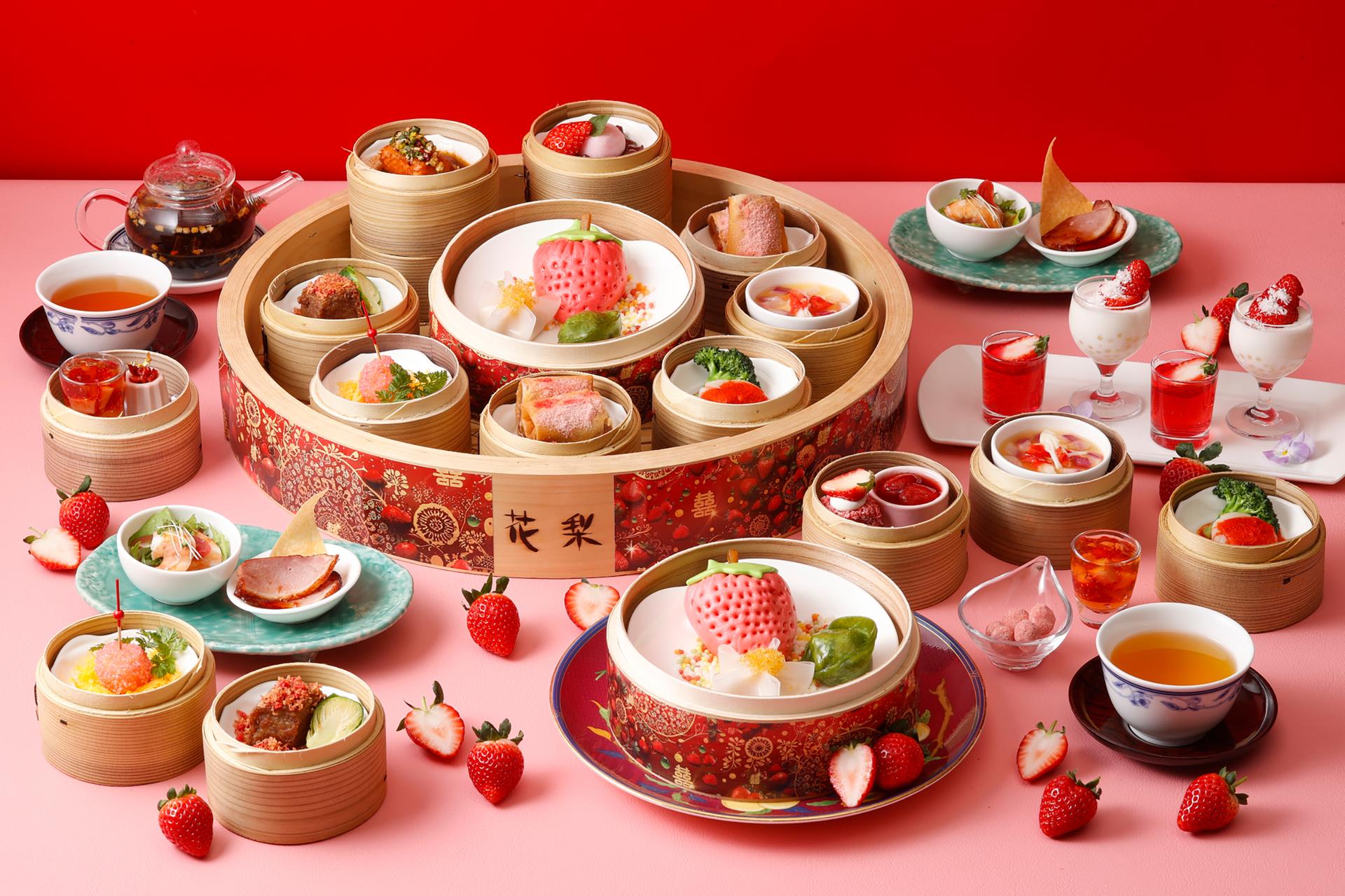 2022年に始まった「花梨」のアフタヌーンティーは、今季いちご尽くしの華やかな一式に。評判の点心には、カスタード餡入りいちご饅頭、紅衣の揚げ海老団子などが登場し、全19品の盛り沢山な内容だ。