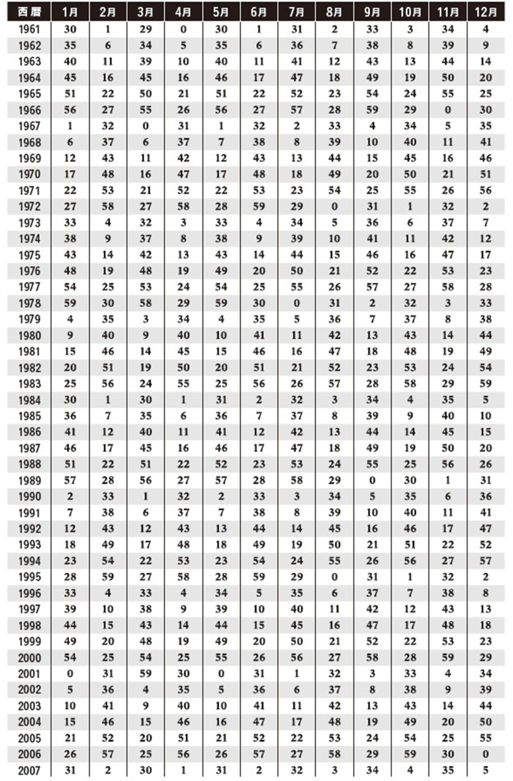 下の【生年月表】で、自分が生まれた年と生まれた月が交差するところの数字を調べます。