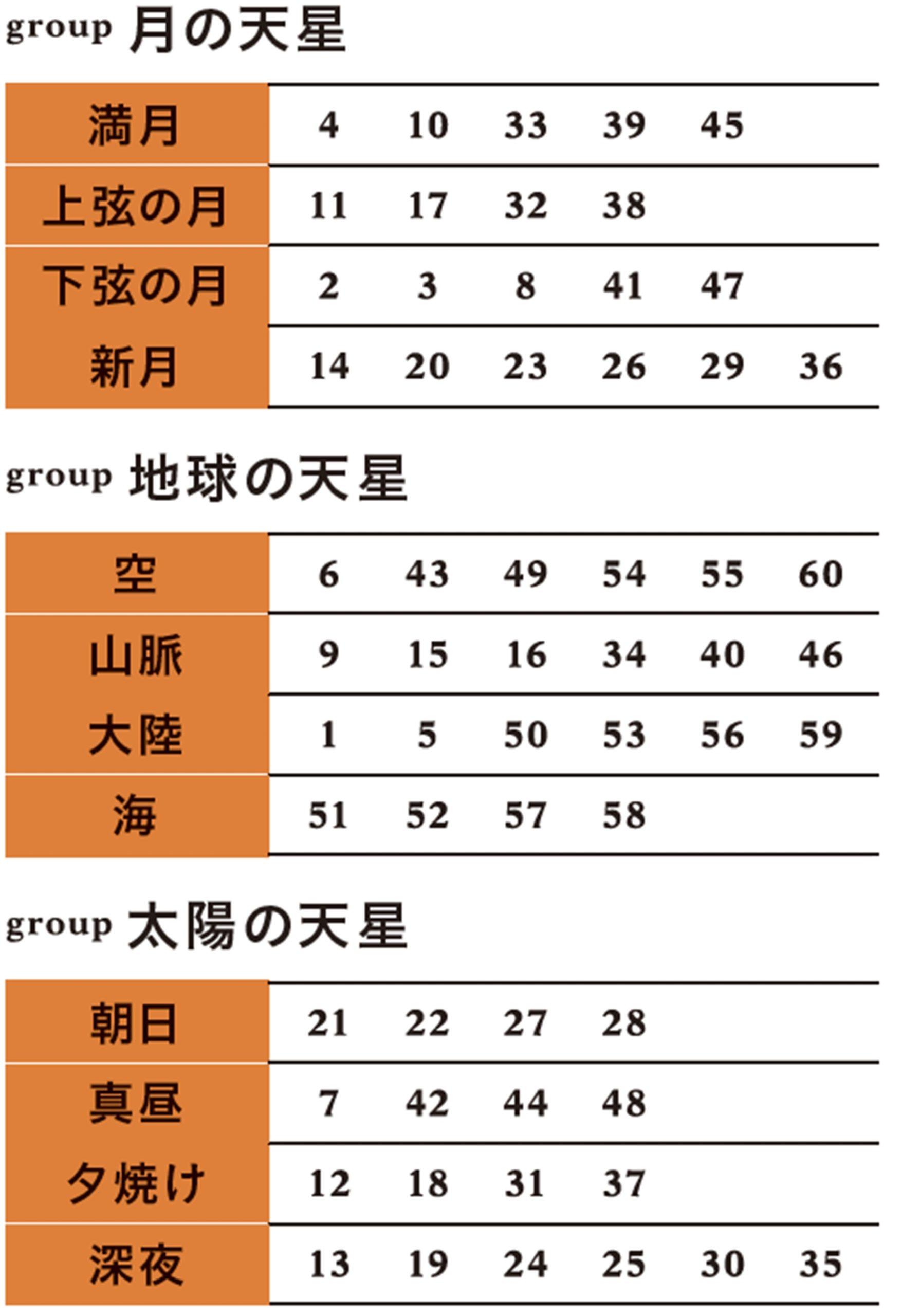 STEP2で割り出した数字を下の【天星対応表】に当てはめ、自分の天星を出します。数字が60を超えた人は、そこから60を引いた数字で当てはめてください。