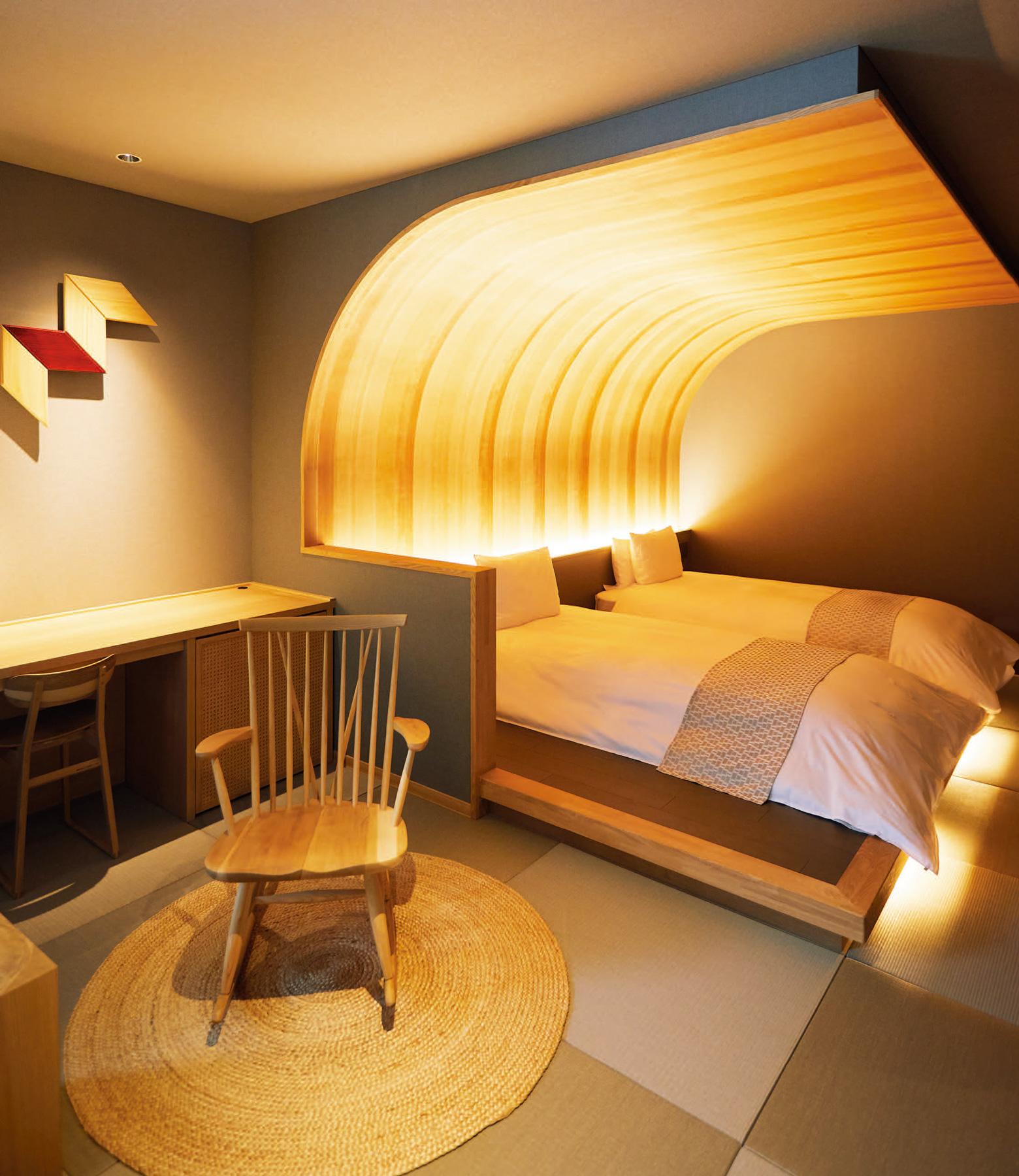 「飛騨MOKUの間」は、曲げ木をモチーフにしたヘッドボードや飛騨家具などが置かれ、飛騨の豊かな森を感じられる空間。